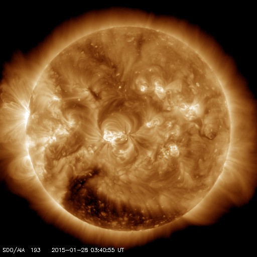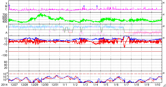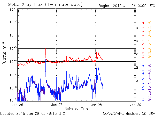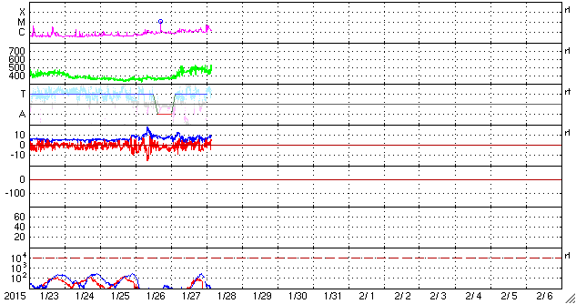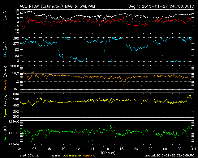 2015/ 1/28 12:47 更新 太陽風は500km/秒台の高速風になっています。Cクラスのフレアが増えています。 担当 篠原 太陽風の速度は、 昨日のニュースの後に450km/秒に上がり、 やや高速の状態になりました。 そして、先ほどからもう一段上がって、 520km/秒の高速風に変わっています。 27日周期の図で比べると、 前周期よりも2日ほど遅れていますが、 高速の太陽風が回帰しているのでしょうか。 太陽風の磁場強度も、5nTから10nTの間で、 やや強まった状態が続いています。 速度とともに、太陽風の変化は続くのかもしれません。 磁気圏の活動もやや高まっていて、 AE指数は、500nTの変化がグラフの後半に目立っています。 太陽風がやや高まっているので、 磁気圏の活動も高まった状態が続く可能性があります。 太陽は、東端から新しい黒点群が上がってきました。 小規模の活動は頻繁に発生している様です。 GOES衛星のX線カメラは、 発生地点は、2268群や2273群や東端付近など分散していますが、 Cクラスの変化が目立つ様になっています。 今後、更に高まっていくか注目して下さい。