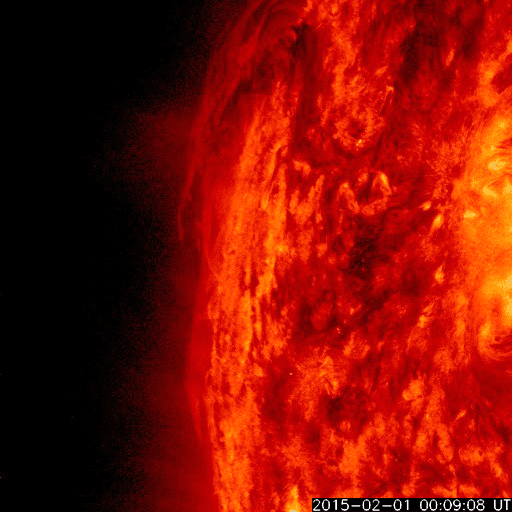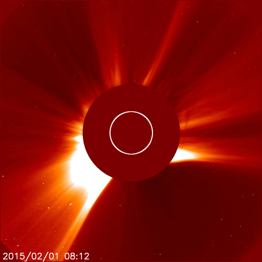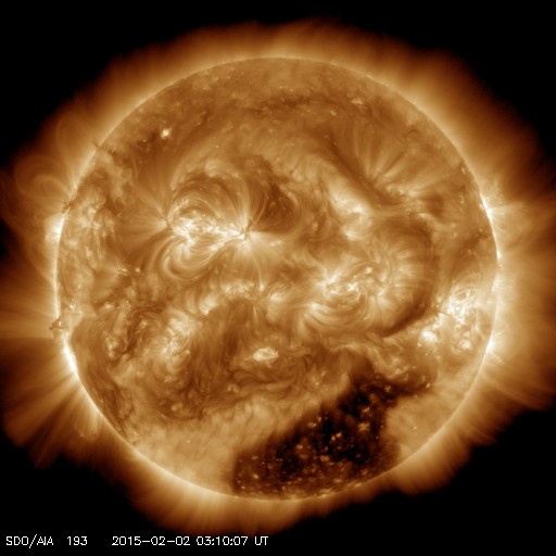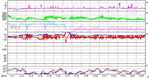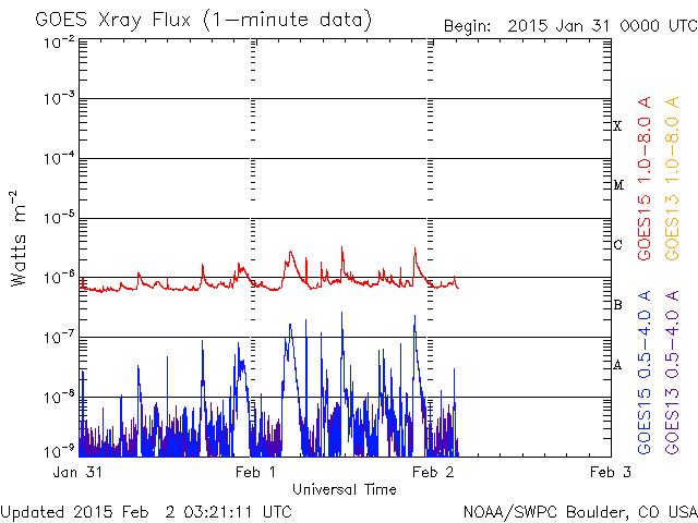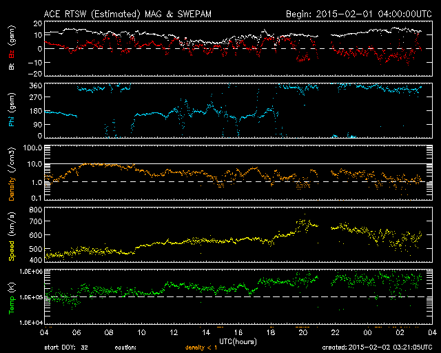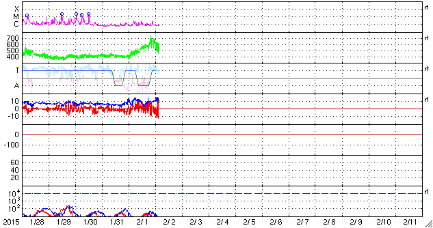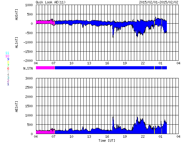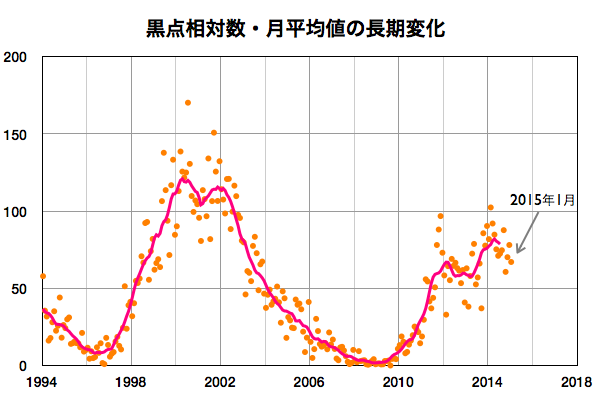 2015/ 2/ 2 12:22 更新 コロナホールの影響で太陽風の速度が高まっています。1月の黒点数は67.0でした。 担当 篠原 WDC-SILSOより、2015年1月の黒点相対数の平均値は、 67.0 と発表されました。 長期変化の図を掲載します。 2014年の後半からの減少傾向に沿った値になっています。 この様子だと、今年の終わりには50を切るのかもしれません。 太陽は、再び小規模のフレアが起きるようになり、 西側(右側)の2268黒点群で、C2.8、C3.2、C3.0、 中央の2277群で、C2.2、C1.5、 などのCクラスフレアが発生しています。 GOES衛星のX線グラフは、細かい変化も増えています。 一方、可視光写真では、黒点の群も数も減っていて、 太陽面はやや寂しくなっています。 昨日の午後に、太陽の東端(左端)でフィラメントの噴出が発生し、 太陽から北東に向かって、CMEが飛び出しています。 SDO衛星とSOHO衛星による動画を掲載します。 なかなかきれいな現象です。 ガスは横に向かって飛び出しているので、 地球への影響はありません。 昨日のニュース以降、太陽風の速度はゆっくりと上昇を続け、 今朝、2日5時(世界時)には、 650km/秒を超えるくらいに高まりました。 その後は下げ始めて、現在は570km/秒の高速状態です。 コロナホールの影響が本格的にやって来た様です。 太陽風の磁場強度は、10nT前後を維持しています。 現在も10nTをやや超える位の強さです。 27日周期の図を見ると、 セクターの切り替わりも来ているようで、 もうしばらく変動が続くかもしれません。 磁場の南北成分は、グラフの後半から南向きが目立っています。 このため、AE指数の変化も後半から目立ち、 500〜800nTの中規模の変化が続いています。 太陽風の磁場強度が高まっているため、 南向きに振れると振れ幅も大きくなりやすく、 高速風になっていることと重なって、 オーロラの活動を強めやすくなっています。 月は大きいですが、ライブカメラに注目して下さい。