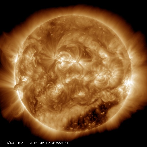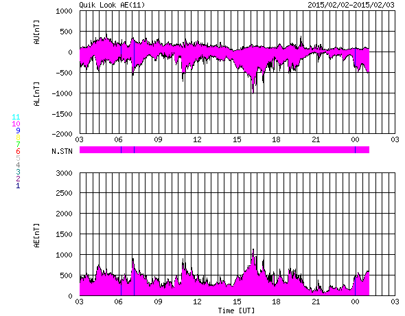 2015/ 2/ 3 11:08 更新 600km/秒台後半の高速太陽風が続いています。 担当 篠原 太陽風の速度は再び高まって、 600km/秒台後半で推移しています。 ACE衛星の観測では、 昨日、2日14時(世界時2日5時)に、 太陽風磁場の強度が、15nTから5nT近くへ急に下がっています。 以降、5nTと平均的な強度で安定しています。 それと反対に、速度は600km/秒から700km/秒近くへ高まり、 昨日いっぱいは700km/秒程度を保ちました。 今日に入って少し下げていますが、 660km/秒前後と高い速度が続いています。 磁気圏の活動も活発に続いています。 AE指数のグラフでは、500nTから1000nTにかけて、 中規模の変動が連続的に観測されています。 極域ではにぎやかなオーロラを見ることができたのではないでしょうか。 SDO衛星AIA193の太陽コロナ写真を見ると、 南半球のコロナホールは太陽の西側(右側)に進み、 これから次第に影響は弱まっていくでしょう。 太陽は、中央の2277黒点群でC1.0とC2.6、 東側に新しく現れた2280群でC1.7の 小規模フレアが発生しています。 全体的には穏やかです。 ![]() SDO衛星のAIA193カメラによる太陽コロナの様子 (c) SDO (NASA) ![]() SDO衛星による太陽の可視光写真。マウスの矢印を写真に重ねると、黒点番号付きの写真に切り替わります。 (c) SDO (NASA) ![]() ACEが観測した太陽風の磁場(1番上の枠、白線は全体の強度、赤線は南北成分) および、太陽風の密度(3番目の橙線)、速度(4番目の黄線) (c) NOAA/SWPC ![]() リアルタイムAE指数 下段のAEグラフの値が高くなると、オーロラ活動が活発化しています。 (c) 京都大学, NICT ![]() 27日の太陽周期に合わせたデータプロット 太陽が同じ面を地球に向けていた27日前の変化から、今後を予想することができます。 (c) 作図:宇宙天気ニュース