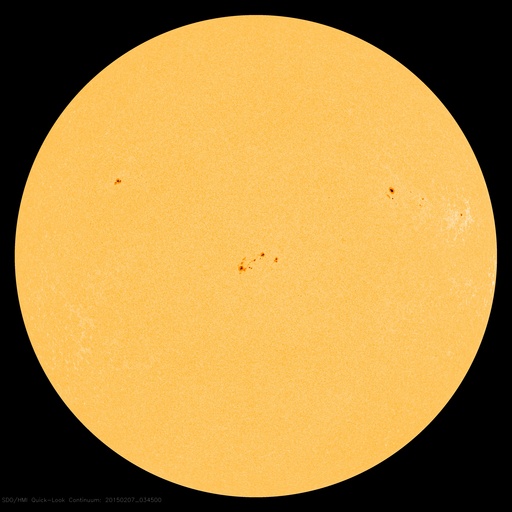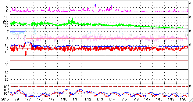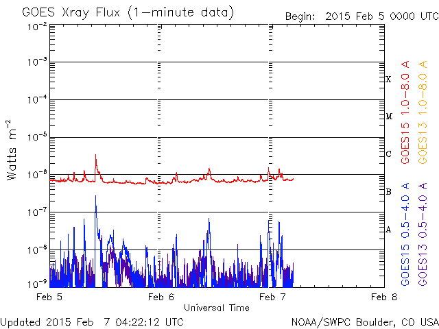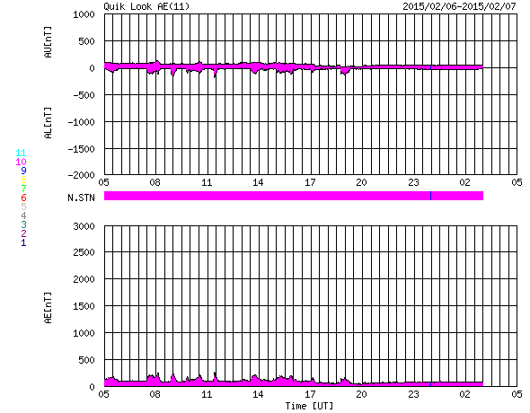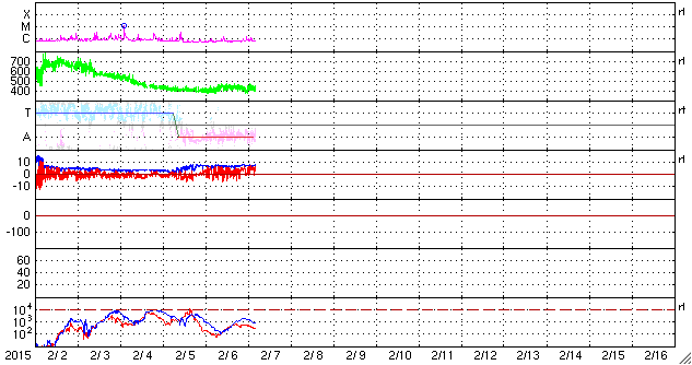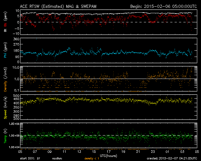 2015/ 2/ 7 13:23 更新 太陽風は穏やかで、磁気圏も静穏です。太陽も穏やかです。 担当 篠原 太陽風は、昨日以降も、 速度430km/秒と平均的な速さが続き、 磁場強度は7nTとやや強めの値で安定しています。 磁場の南北成分は、北寄りの傾向になっていて、 ACE衛星のグラフの赤線は、 0nTよりも上で変化するようになっています。 このため、太陽風から磁気圏へのエネルギーの流入は弱まっていて、 磁気圏は穏やかです。 AE指数は、小さい変化がぽつぽつ見られる程度です。 27日周期の図の前周期の太陽風は、 現在の様な値がもう4日ほど続き、 その後、速度が更に下がって低速風に変わっています。 同様の変化が見られるとすると、 これから10日程度、穏やかな太陽風が続きそうです。 太陽も穏やかです。 2277黒点群、2280群、2281群それぞれで、 C1の小さいフレアが起きた程度です。 放射線帯の高エネルギー電子は、低下が始まり、 既に1000にまで下がっています。