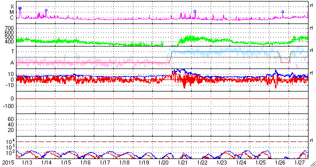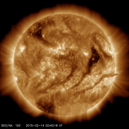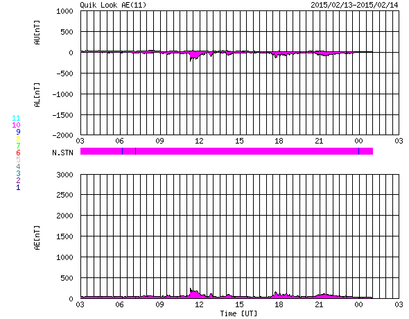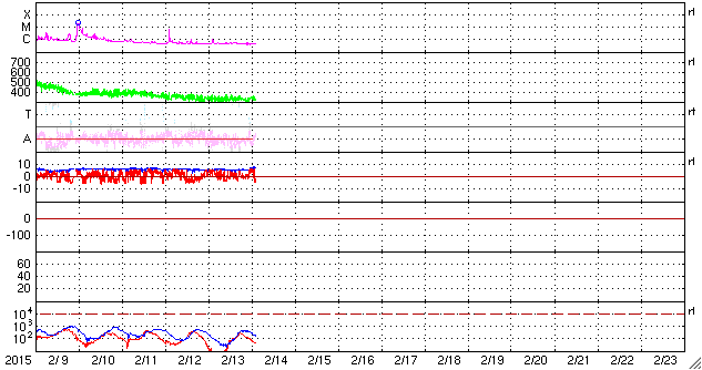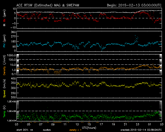2015/ 2/14 11:58 更新 低速の太陽風が続いています。太陽も穏やかです。 担当 篠原 太陽風は、速度は320〜350km/秒と、 低速の風が続いています。 磁場強度は、5nTと平均的な値が続いていましたが、 今朝くらいから少し高まって、現在は8nT近くに変化しています。 コロナホールの影響が届きかけているのかもしれません。 磁場の南北成分は、北寄りの傾向です。 低速風であることも重って、磁気圏は静穏で、 AE指数は、小さい変化が時々見られる程度す。 太陽風は、これからコロナホールの影響で多少強まるのか、 このまま穏やかに推移するのか、注目して下さい。 太陽は、目立ったフレアの発生はなく、 静かです。 目立つ黒点も、中央の2282黒点群程度です。 ![]() SDO衛星のAIA193カメラによる太陽コロナの様子 (c) SDO (NASA) ![]() SDO衛星による太陽の可視光写真。マウスの矢印を写真に重ねると、黒点番号付きの写真に切り替わります。 (c) SDO (NASA) ![]() ACEが観測した太陽風の磁場(1番上の枠、白線は全体の強度、赤線は南北成分) および、太陽風の密度(3番目の橙線)、速度(4番目の黄線) (c) NOAA/SWPC ![]() リアルタイムAE指数 下段のAEグラフの値が高くなると、オーロラ活動が活発化しています。 (c) 京都大学, NICT ![]() 27日の太陽周期に合わせたデータプロット 太陽が同じ面を地球に向けていた27日前の変化から、今後を予想することができます。 (c) 作図:宇宙天気ニュース