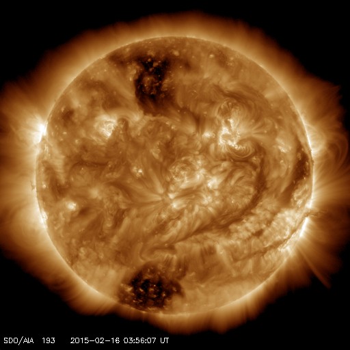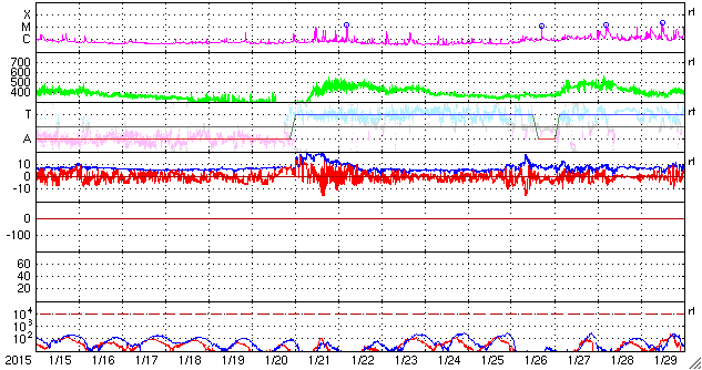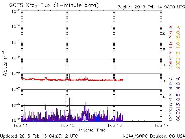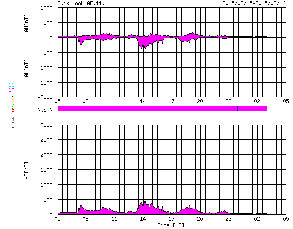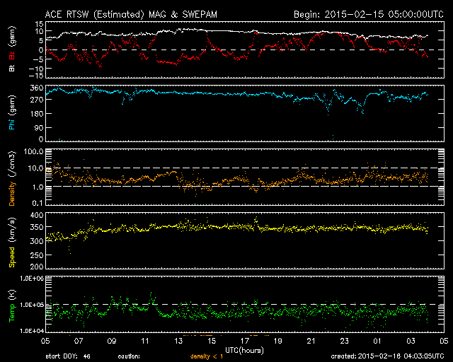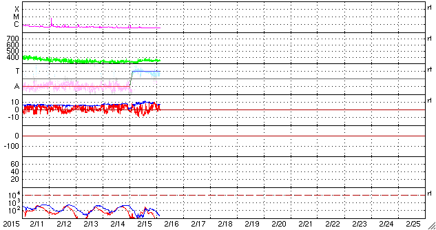 2015/ 2/16 13:04 更新 低速の太陽風が続いています。太陽も穏やかです。 担当 篠原 昨日、見え始めていた太陽風磁場のセクターの切り替わりは、 その後も続いています。 27日周期の図のセクターのグラフを比べると、 前周期よりも2日早く変化が来た様です。 それとともに、磁場強度は10nTへ、速度は350km/秒へ、 それぞれ少し高まりました。 しかし、前周期の切り替わりと比べると、 変化はどちらも小幅になっています。 現在の太陽風は、速度は350km/秒と低速のままで、 磁場強度は、既に5nT近くに下がっています。 太陽風磁場の南北成分は、 磁場が強まった頃に南向きにも振れたため、 AE指数は、300〜400nTの小規模の変化が起きています。 しかし、現在は再び北寄りになり、 磁気圏は静かになっています。 SDO衛星AIA193の太陽コロナは、 南北の高緯度域にコロナホールが見えています。 緯度が高いため、影響は及びにくいでしょう。 ただ、前周期よりも少し低緯度側に広がっているので、 3〜4日後くらいの太陽風に 変化が見られる様になるかもしれません。 太陽は穏やかで、 GOES衛星のX線グラフに、目立った変化はありません。 黒点も、2282黒点群が目立つ程度で、 太陽は全体的に寂しくなっています。