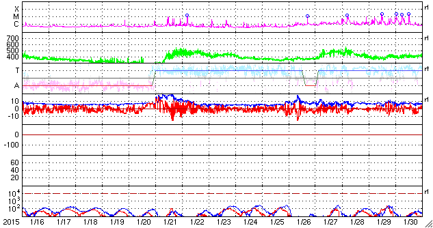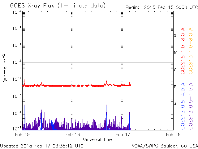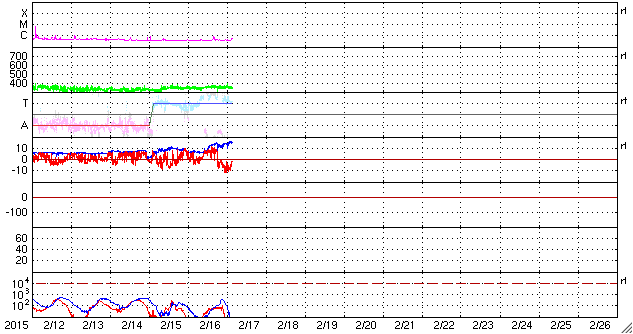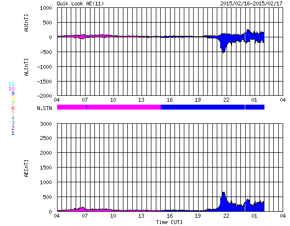 2015/ 2/17 12:32 更新 太陽風の磁場が強まって、磁気圏の活動もやや高まっています。ヘルシンキのオーロラをどうぞ。 担当 篠原 2012年から毎年オーロラの写真をいただいている 谷口直樹さんより(以前の写真は読者写真集よりどうぞ)、 今朝撮られたばかりのオーロラ写真が届きました。 谷口さんは、これから高緯度のオーロラ帯へ向かうところで、 乗り継ぎのためヘルシンキに滞在していたそうです。 空港近くのホテルの窓から、現地17日2〜4時にかけて、 北の彼方にオーロラが見えたそうです。 太陽風のデータを見ると、昨夜から磁場強度が高まり始め、 今日に入った頃に15nTに強まり、現在も続いています。 それとともに、磁場の南北成分も変化が大きくなって、 17日4時(世界時16日19時)頃からは南向きに切り替わって、 -10nT近くまで大きく振れています。 太陽風の速度は、350km/秒と低速のまま安定していますが、 磁場の変化に伴って、磁気圏の活動も強まり、 AE指数のグラフは、300〜700nTの変化が後半から起きています。 ちょうどこの活動の高まりに、 谷口さんはヘルシンキで遭遇したようです。 ヘルシンキは緯度がまだ低く、オーロラ帯からはやや離れていますが、 オーロラの活動が強まったことで、北の低空に見えたのでしょう。 谷口さんは、これから一週間ほどオーロラを観測するそうで、 素晴らしいオーロラに出会えるとよいですね。 速報をどうもありがとうございます。 太陽は、X線のグラフはほとんど変化がなく、 とても静かです。 黒点も、2282群の2つが見えている程度です。