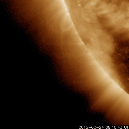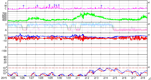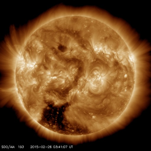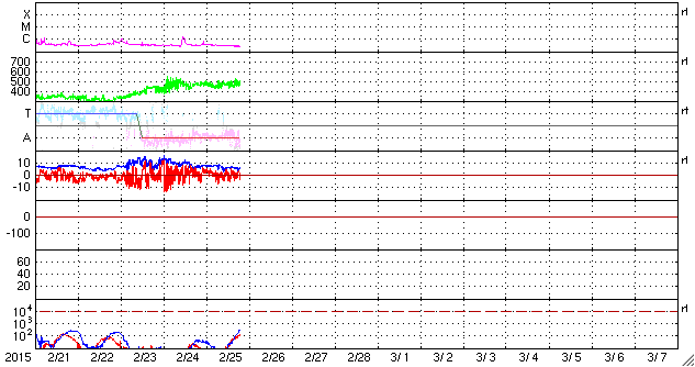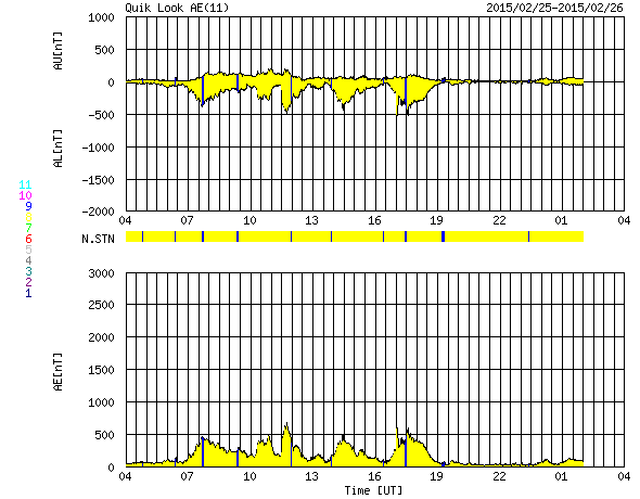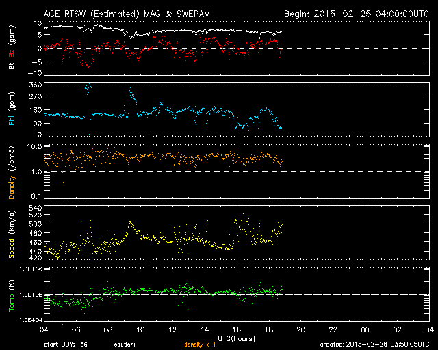 2015/ 2/26 12:52 更新 やや高速の太陽風が続いています。太陽は静かです。フィンランドのオーロラをどうぞ。 担当 篠原 フィンランド北部のキッテラ、シルッカへ オーロラ撮影旅行中の木盟良三さんより、 現地23日1時半に撮影されたオーロラの写真をいただきました。 データを見ると、太陽風は低速(350km/秒)でしたが、 磁場が南向きに振れて(-5nT)、 オーロラの活動度がやや高まった頃の撮影の様です。 こちらはスキーリゾートだそうで、 ホテルはスキー場のゴンドラに乗って中腹にあるそうです。 このため、下の方に町の灯りが広がっています。 1枚目の写真では、右上にカシオペヤ座、 中央にペルセウス座、ぎょしゃ座が並び、 オーロラの光の帯のすぐ横にはプレアデス星団の星の集まりが写っています。 巻き込むようなオーロラの渦がとても印象的な写真です。 どうもありがとうございます。 23日に始まった太陽風の高まりは、現在も続いていて、 速度は480km/秒前後とやや高速の状態です。 磁場強度は7nTから5nTへやや下がり、平均的な値に戻っています。 磁気圏の活動はある程度活発に発生していて、 AE指数は500nTの中規模の変化が繰り返し起きています。 後半では静かになっていますが、 ここまではにぎやかなオーロラの発生が見られたのではないでしょうか。 磁場強度が下がってきたので、速度の高まりもこれから弱まりそうです。 一方、SDO衛星AIA193では、南半球のコロナホールが 太陽の中央線に達しつつあります。 2〜3日後くらいから、こちらの影響が始まりそうです。 太陽は、X線のグラフは平坦で、とても穏やかです。 黒点も2290黒点群が見えている程度です。 一日遅れですが、昨日のニュースで紹介した、 太陽の南東部(左下)で発生した活動の様子を動画で紹介します。 裏側で発生したフレアによる変動の様で、 SDO衛星AIA193、SOHO衛星LASCO C2、C3と、 コロナのガスが噴き出していく様子が撮影されています。 太陽では、この前後にも裏側でCMEが発生しています。 こちら側は静かですが、反対側では活動が続いている様です。