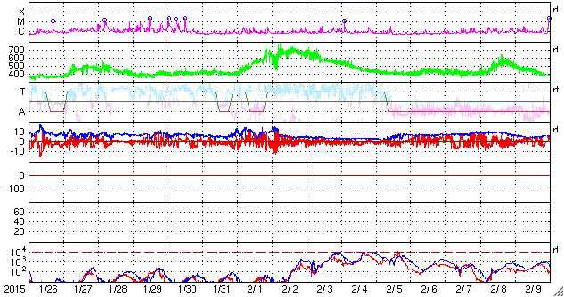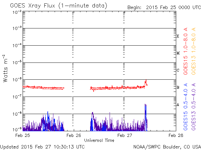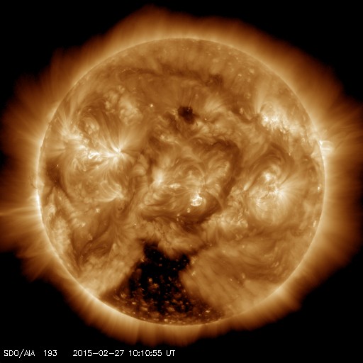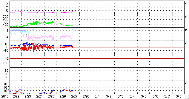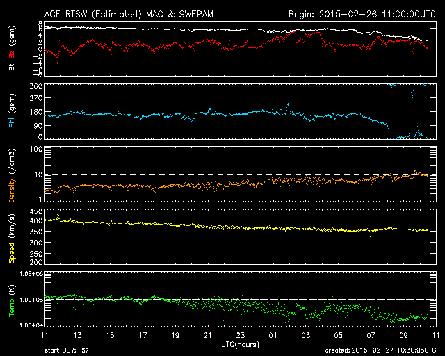 2015/ 2/27 19:30 更新 太陽風は低速になっています。コロナホールの影響が近づいています。 担当 篠原 太陽風の速度は、昨日のニュース以降ゆっくりと下がり、 今日に入った頃には400km/秒と通常の速度に戻り、 その後、更に下がって、昼には350km/秒に下がり、 低速の風に変わっています。 磁場強度は、6nTと平均的な値が続いていましたが、 夕方くらいから弱まっています。 セクターの境界に差しかかっているための様で、 27日周期の図を見ると、 「A」から「T」へ切り替わりかけています。 磁場の南北成分は、0nTから北寄りで推移しています。 このため、磁気圏は穏やかになっていて、 AE指数のグラフはほとんど変化が起きていません。 太陽風は低速になりましたが、 SDO衛星AIA193では、南半球の高緯度のコロナホールが、 太陽の中心線を越えているところで、 この領域からの高速太陽風が今後到来しそうです。 27日周期の図では、2月1日に太陽風が強まっています。 現在のコロナホールの位置を比べると、 今回は1〜2日程度始まりが遅れそうです。 今後の変化に注目して下さい。 太陽は、目立った変化はなく、 穏やかな状態が続いています。 今日は学校の終業式で、様々な用事が重なってしまい、 昼に記事を書く時間が取れませんでした。 更新が夜になってしまい申し訳ありません。 明日から春休みですが、成績の報告、福岡で研究集会、 種子島ロケットコンテストと行事が連なっていて、 慌ただしく過ぎ去りそうです。