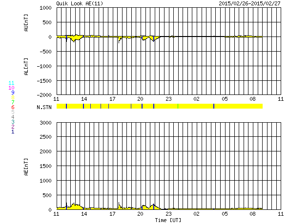 (c) SDO (NASA) ![]() SDO衛星による太陽の可視光写真。マウスの矢印を写真に重ねると、黒点番号付きの写真に切り替わります。 (c) SDO (NASA) ![]() ACEが観測した太陽風の磁場(1番上の枠、白線は全体の強度、赤線は南北成分) および、太陽風の密度(3番目の橙線)、速度(4番目の黄線) (c) NOAA/SWPC ![]() リアルタイムAE指数 下段のAEグラフの値が高くなると、オーロラ活動が活発化しています。 (c) 京都大学, NICT ![]() 27日の太陽周期に合わせたデータプロット 太陽が同じ面を地球に向けていた27日前の変化から、今後を予想することができます。 (c) 作図:宇宙天気ニュース
