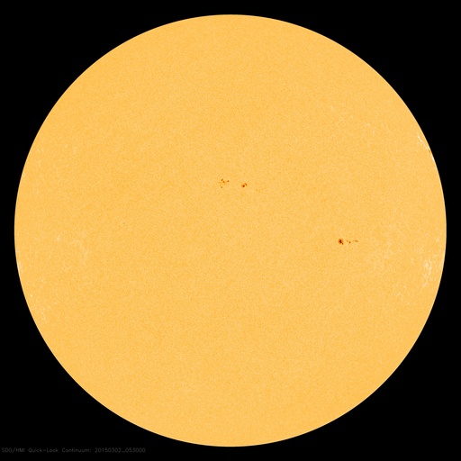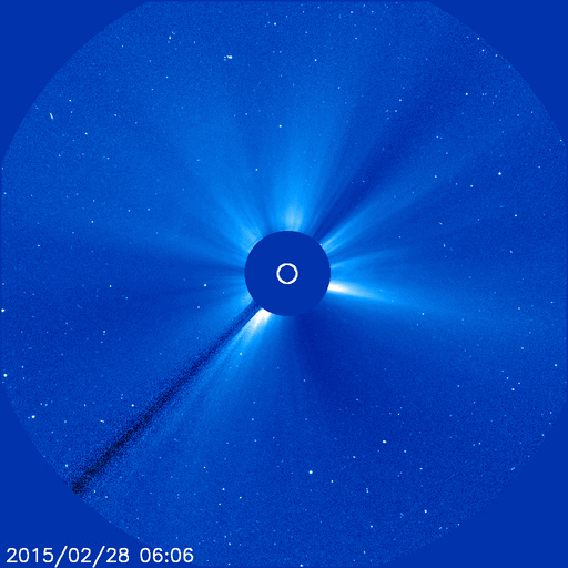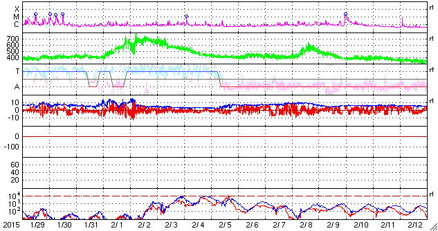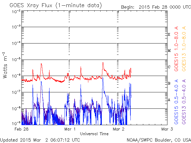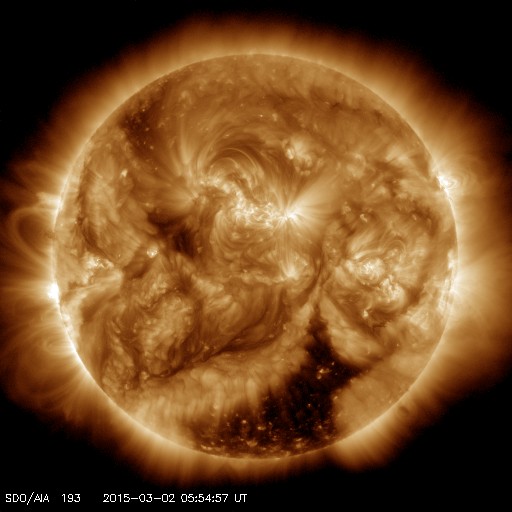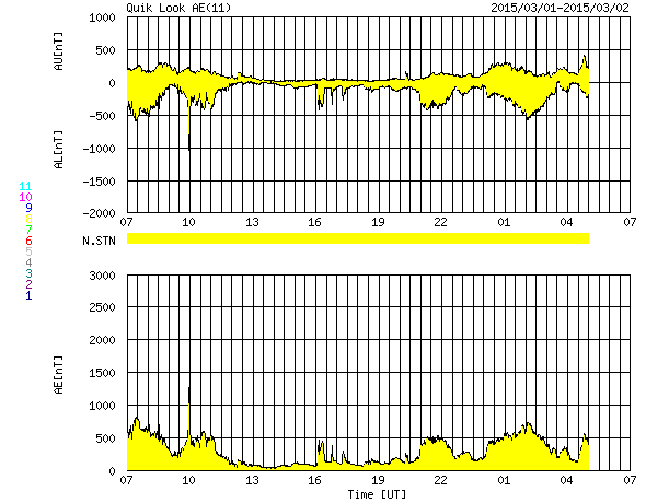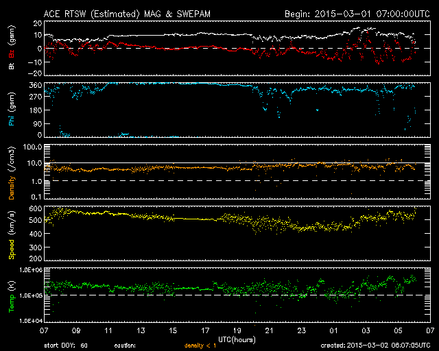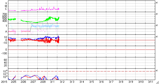 2015/ 3/ 2 15:07 更新 500km/秒台の高速太陽風が続いています。磁気圏の活動も活発です。 担当 篠原 SOHO衛星LASCO C3の動画を見ると、 28日以降CMEがいくつも噴き出しています。 このうち、後半の北西(右上)に向かって飛び出しているCMEは、 2290黒点群のC3.7、C6.8の小規模フレアに関係している様です。 一方、太陽を包む様に広がるハロー型のCMEは、 SDO衛星では対応する現象が見つけられず、 太陽の裏側で発生している様です。 太陽の反対側で、活発な活動が発生している様です。 北西端の2290黒点群は、 この他にもC1〜2の小さいフレアを起こしていて、 活発になっていますが、 もうすぐ没して見えなくなります。 太陽風は、500〜550km/秒の高速状態が続いてます。 磁場強度も、10nTに高まった状態です。 磁場強度の強まりが続いているので、 速度はもう一段高まるかもしれません。 磁場の南北成分は、 ACEのグラフの前半と後半で南北に大きく変化しています。 磁気圏の活動も高まっていて、 AE指数のグラフは、500〜800nTの中規模の変化が続いています。 SDO衛星AIA193では、 南半球のコロナホールは、太陽の西側に通り過ぎたところで、 影響はもうしばらく続きそうです。