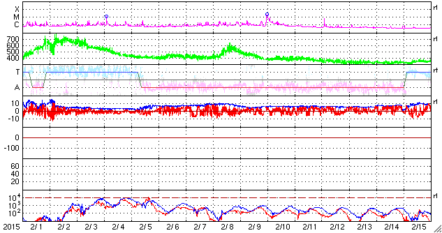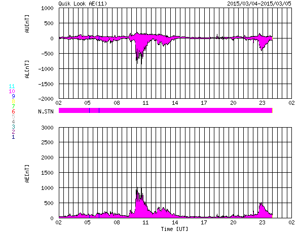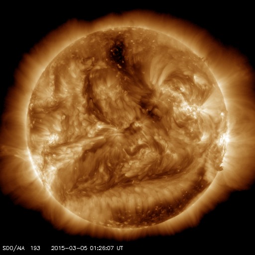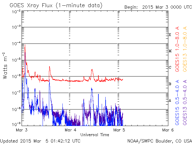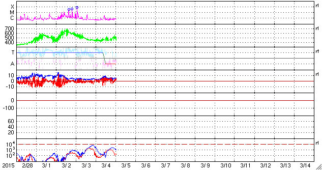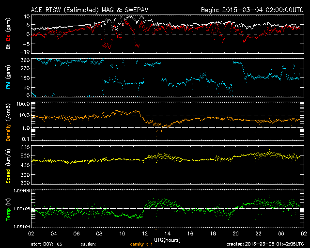 2015/ 3/ 5 10:42 更新 太陽は穏やかです。太陽風は再び高速になっています。 担当 篠原 太陽は、2290黒点群が沈んで、 活動は静かになっています。 昨日は、西の端の2292黒点群で C2.8の小規模フレアが起きた程度です。 黒点も少なく、目立たなくなっています。 太陽風は、昨夜、4日19時(世界時4日10時)頃に 磁場の強まりが到来し、一時的に10nTに上がりました。 その後は、5nTと平均的な状態です。 同様に速度にも小規模の高まりがやって来て、 450km/秒に下がりかけていた速度が、 500km/秒へ再び高まっています。 太陽風の変化としては、この程度で終わりそうです。 太陽風磁場は北を向いている時間帯が多かったのですが、 強度が高まった時に南に大きく振れて、 AE指数で1000nTに達する大きな磁気圏の活動を起こしています。 その他の時間帯では、磁気圏は穏やかです。 SDO衛星AIA193の太陽写真では、 北半球の淡いコロナホールが中心線を通過しています。 2日後くらいに弱い影響がやって来るかもしれません。 現在、高速船に乗って鹿児島湾を南下しています。 昼に種子島について、午後からロケットコンテストに参加します。 打ち上げなどの本番は明日の予定です。 天候が心配ですが、にぎやかな大会になりそうです。 ![]() SDO衛星のAIA193カメラによる太陽コロナの様子 (c) SDO (NASA) ![]() SDO衛星による太陽の可視光写真。マウスの矢印を写真に重ねると、黒点番号付きの写真に切り替わります。 (c) SDO (NASA) ![]() GOES衛星の太陽X線データ (c) NOAA/SWPC ![]() ACEが観測した太陽風の磁場(1番上の枠、白線は全体の強度、赤線は南北成分) および、太陽風の密度(3番目の橙線)、速度(4番目の黄線) (c) NOAA/SWPC ![]() リアルタイムAE指数 下段のAEグラフの値が高くなると、オーロラ活動が活発化しています。 (c) 京都大学, NICT ![]() 27日の太陽周期に合わせたデータプロット 太陽が同じ面を地球に向けていた27日前の変化から、今後を予想することができます。 (c) 作図:宇宙天気ニュース