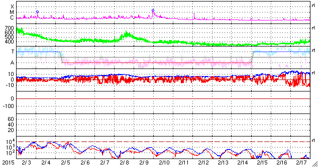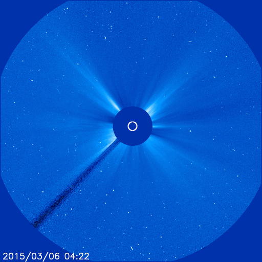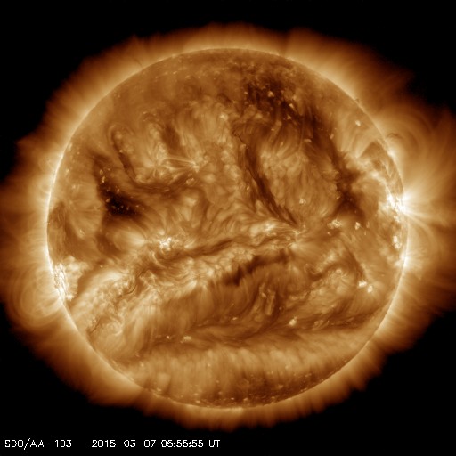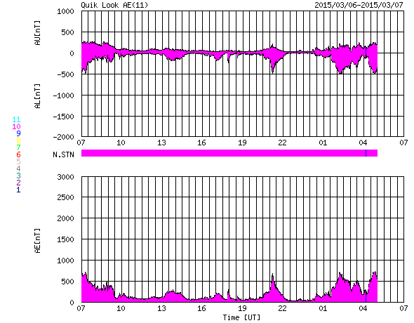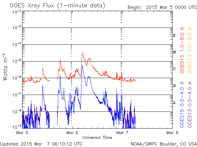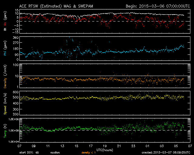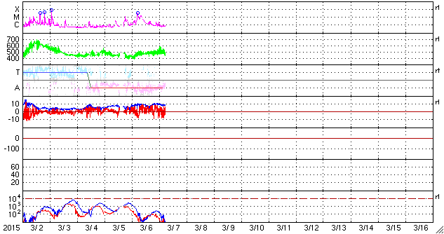 2015/ 3/ 7 15:10 更新 太陽の東端から2297黒点群が現れました。太陽風は500km/秒の高速風が続いています。 担当 篠原 太陽の東端の中規模フレアを起こした領域は、 2297黒点群と番号が付きました。 昨日のM3.0フレアの後にも、 もうひとつM1.5の中規模フレアを起こし、 その後、C2.6、C2.2、C2.2などの小規模フレアを起こしています。 活動はやや落ち着いている様ですが、注目して下さい。 昨日のM3フレアに伴って、CMEが発生しています。 SOHO衛星LASCO C3による動画を掲載します。 太陽から横に向かって噴き出しているので、 地球への影響はないでしょう。 太陽風は、速度が500km/秒に高まった状態が続いています。 一方、磁場強度は、10nTから8nTの間を上下に変化しています。 このため、速度はもう一段高まるかもしれません。 27日周期の図を見ると、前周期はちょうど今頃に、 600km/秒近い速度の高まりが到来しています。 磁場の南北成分は、比較的北寄りに推移していますが、 南に振れる時間帯もあり、 これに対応して磁気圏でもオーロラの活動が発生しています。 AE指数のグラフでは、500nT程度の中規模の変化が、 数回にわたって発生しています。 種子島ロケットコンテストは、今日の講演会で終了です。 こちらは今日も雨で、 小雨の中とはいえ、昨日実施できて良かったです。 参加者200名を超える大会は、とても楽しいものでした。 種子島は明日まで滞在します。 せめて最後は好天になって欲しいものです。