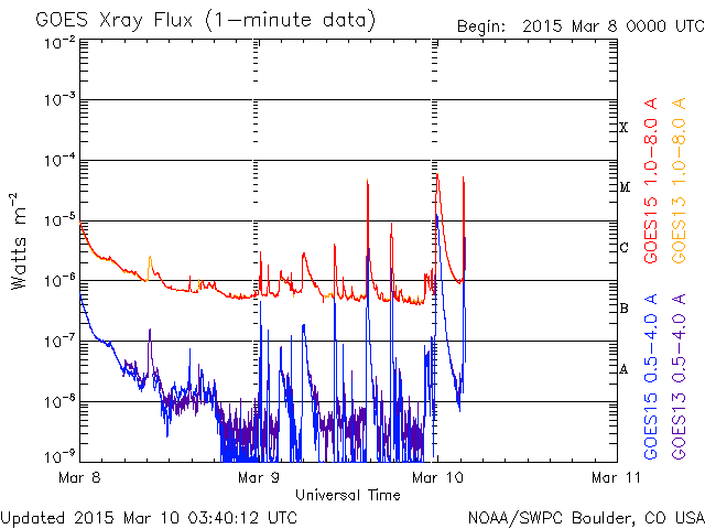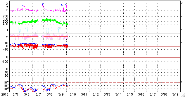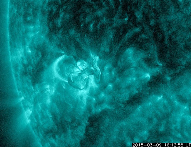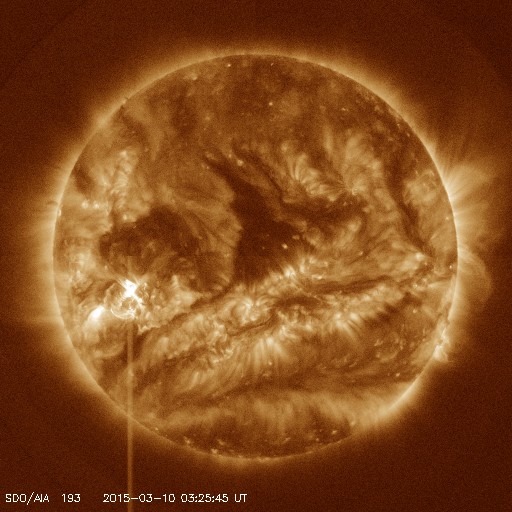 2015/ 3/10 12:40 更新 2297黒点群で中規模フレアが3回発生しました。太陽風は平均的な状態に戻っています。 担当 篠原 活動の高まっている2297黒点群で、 更に3つのMクラスフレアが発生しました。 昨夜、9日23時半(世界時9日14時半)のM4.5と、 今朝、10日8時半(世界時9日23時半)のM5.8、 そして、記事を書いている最中の 10日12時半(世界時10日3時半)にも、 M5に達するフレアが起きました。 M5.8のフレアは、X線強度の変化がより長く続くタイプです。 SDO衛星AIA131とAIA193の動画を掲載します。 周囲のコロナの激しい変化も合わせてご覧下さい。 このフレアに伴って、 CME(太陽ガスの放出現象)も発生している可能性がありますが、 SOHO衛星の写真はまだ揃っていないので、 詳細は明日お知らせします。 2297黒点群は、この他にも、C9.1、C4.0、C3.0、 などのCクラスフレアを多く起こしていて、 GOES衛星のX線グラフはにぎやかになっています。 その一方、現在の太陽面にはこの黒点群しか見えておらず、 孤軍奮闘となっています。 引き続き2297群の活動に注目して下さい。 太陽風は、ゆっくりと速度が下がり続けて、 現在は400km/秒と平均的な速度に戻っています。 磁場強度も、5nTと平均的な値で安定しています。 磁場の南北成分は、北寄りに振れる様になり、 磁気圏は静かになっています。 AE指数のグラフはほとんど変化が見られません。 SDO衛星AIA193の太陽写真では、 中央部に三角形をしたコロナホールが見えています。 この領域の影響が3日後の13日頃に地球へやって来るかもしれません。 27日周期の図の前周期を見ると、 前周期のこの頃には特に目立った変化は来ませんでした。 今回はどうなるでしょうか。 記事をアップする直前に、M5のフレアが発生し、 慌てて記事を書き足しました・・・ 掲載のSDO衛星AIA193が、 M5フレアの瞬間の写真になっています。 ![]() 2297黒点群で、M5.8の中規模フレアが発生しました。SDO衛星AIA131とAIA93による動画です。 (c) SDO (NASA)、 (動画加工 : 宇宙天気ニュース) ![]() SDO衛星のAIA193カメラによる太陽コロナの様子 (c) SDO (NASA) ![]() SDO衛星による太陽の可視光写真。マウスの矢印を写真に重ねると、黒点番号付きの写真に切り替わります。 (c) SDO (NASA) ![]() GOES衛星の太陽X線データ (c) NOAA/SWPC ![]() ACEが観測した太陽風の磁場(1番上の枠、白線は全体の強度、赤線は南北成分) および、太陽風の密度(3番目の橙線)、速度(4番目の黄線) (c) NOAA/SWPC ![]() リアルタイムAE指数 下段のAEグラフの値が高くなると、オーロラ活動が活発化しています。 (c) 京都大学, NICT ![]() 27日の太陽周期に合わせたデータプロット 太陽が同じ面を地球に向けていた27日前の変化から、今後を予想することができます。 (c) 作図:宇宙天気ニュース