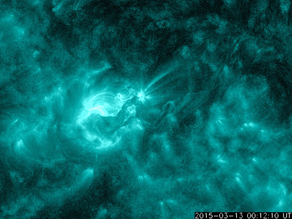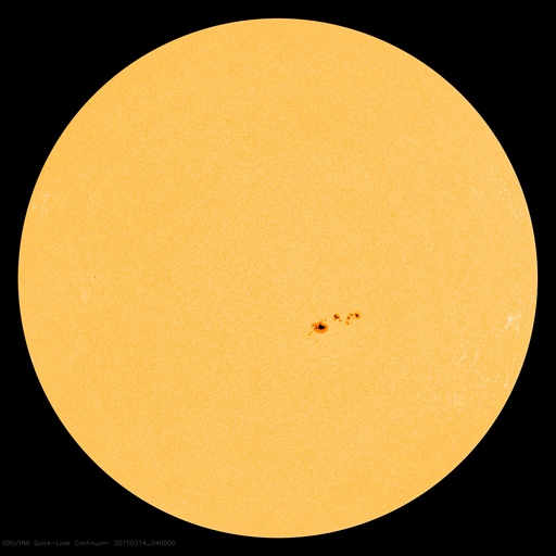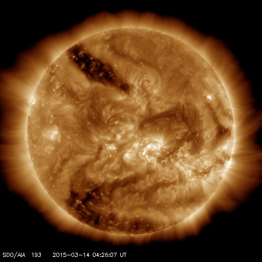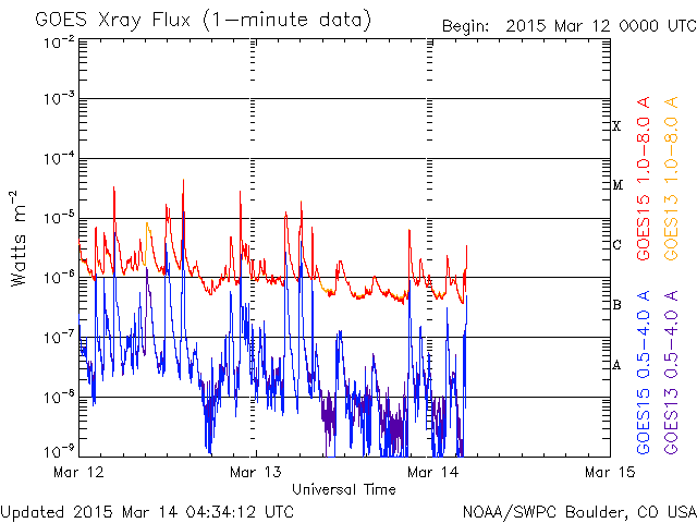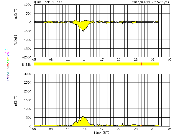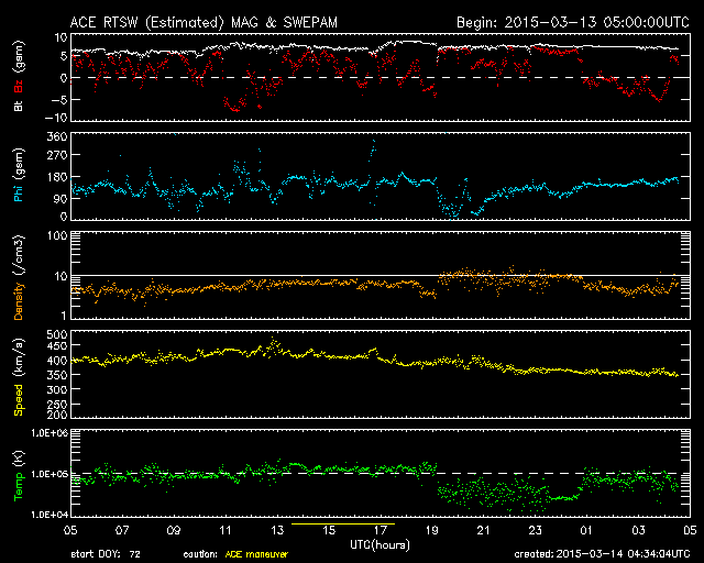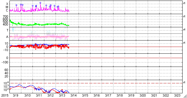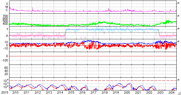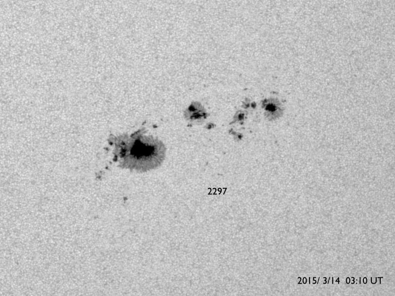 2015/ 3/14 13:32 更新 2297黒点群の活動がやや弱まっています。太陽風は穏やかです。 担当 篠原 活発にフレアを起こしていた2297黒点群の勢いが、 下がってきています。 昨日のニュースの直後、13日の昼に、 M1.2、M1.8の中規模フレアを起こしたものの、 以降は、C6.9、C6.2やC1〜2程度の小規模フレアを 6回程度起こしただけです。 GOES衛星のX線グラフも、フレアの頻度が下がるとともに、 全体の強度も低下しています。 可視光の拡大写真を掲載しますが、 2297群は、黒点の数を減らしながら、 横方向により分散している様です。 フレアの活動を一休みして、再び強まる場合もありますが、 2297群はこのまま静まっていくのでしょうか。 太陽風の速度は、 昨日いっぱいは400km/秒と平均的な状態でしたが、 今日に入った頃からゆっくりと下がって、 350km/秒とやや低速の風になっています。 磁場強度は、6nTから7nTと少しだけ高くなっています。 12日未明のX2フレアに伴うCMEによる 太陽風の乱れを予想していましたが、 目立った変化は見られません。 現在は、発生から2日半ほど経過したところで、 今夜から明日くらいまでは注目して下さい。 ただし、到来が遅くなっているので、 速度の変化は小さくなるでしょう。 太陽風磁場の南北成分は、基本的に期向きで、 時々南に振れる程度です。 このため、AE指数も500nTの変化が グラフの中央にひとつ起きている程度です。