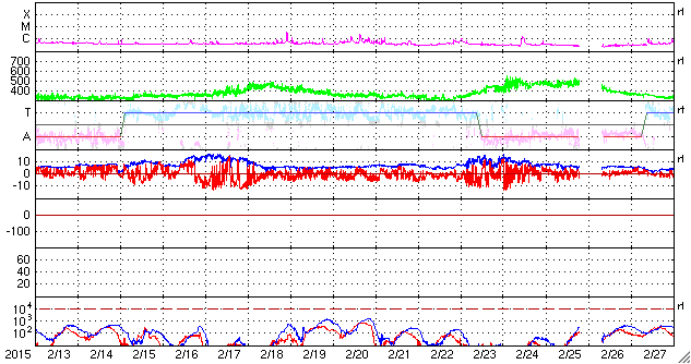 (c) SDO (NASA)、 (写真加工 : 宇宙天気ニュース) ![]() SDO衛星のAIA193カメラによる太陽コロナの様子 (c) SDO (NASA) ![]() SDO衛星による太陽の可視光写真。マウスの矢印を写真に重ねると、黒点番号付きの写真に切り替わります。 (c) SDO (NASA) ![]() GOES衛星の太陽X線データ (c) NOAA/SWPC ![]() ACEが観測した太陽風の磁場(1番上の枠、白線は全体の強度、赤線は南北成分) および、太陽風の密度(3番目の橙線)、速度(4番目の黄線) (c) NOAA/SWPC ![]() リアルタイムAE指数 下段のAEグラフの値が高くなると、オーロラ活動が活発化しています。 (c) 京都大学, NICT ![]() 27日の太陽周期に合わせたデータプロット 太陽が同じ面を地球に向けていた27日前の変化から、今後を予想することができます。 (c) 作図:宇宙天気ニュース