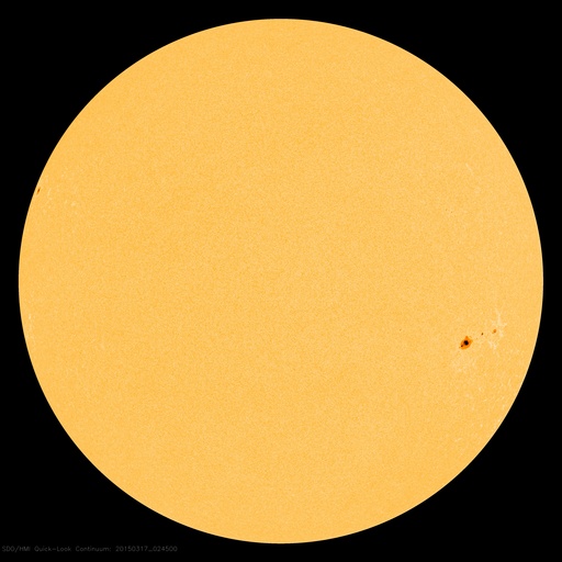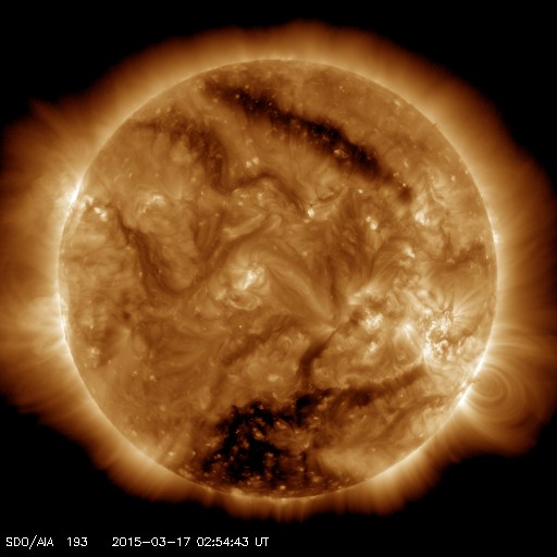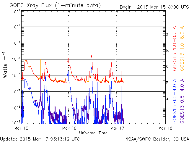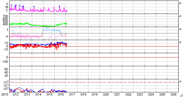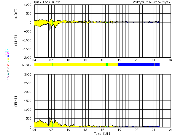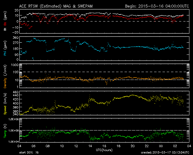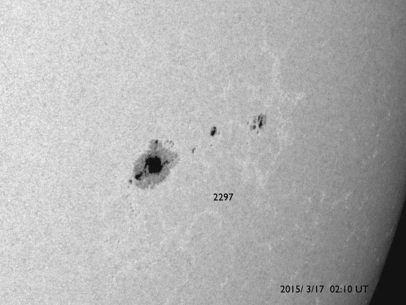 2015/ 3/17 12:12 更新 2297群のフレアは続いています。CMEによる太陽風の乱れが近づいています。 担当 篠原 2297黒点群は、次第に太陽の西の端に近づいています。 しかし、可視光写真を見ると、 黒点の数は減っていて、寂しくなっています。 フレアの活動は続いています。 昨夜も、16日19時半(世界時16日10時半)に M1.6の中規模フレアを起こし、 その後、C5.5、C8.1などを含めて、 Cクラスの小規模フレアを6回ほど起こしています。 黒点の様子から、活動は次第に弱まりそうです。 また、太陽の端に近づいているので、 地球へ影響が及ぶ可能性も小さくなっています。 太陽は、北東の端(左上)から新しい黒点が顔を出しています。 どの様な活動度の黒点でしょうか。 太陽風は、昨日、16日14時(世界時16日5時)に 磁場強度が急に13nTに強まる変化が発生しています。 磁場の強まりはその後も続いていて、 現在も10nT付近で推移しています。 速度も、350km/秒から430km/秒へ、 小幅ですがゆっくりと変化しています。 27日周期の図を見ると、 前周期の2月16日にも似た様な磁場の強まりが到来しています。 今回の変化は、この回帰かもしれません。 磁場の南北成分は、北向きに強まっています。 このため、磁気圏は穏やかで、 AE指数は、変化がやって来た中盤以降は、 ほとんど変化していません。 昨日お知らせしたCMEによる太陽風の乱れが、 地球に近づいていると考えられます。 今夜から明日にかけて、太陽風の強まりに注目して下さい。 磁場が南向きに大きく振れると、 オーロラの活動も強まるでしょう。 新月に近いので、夜空の条件は良く、 オーロラのライブカメラにも注目して下さい。