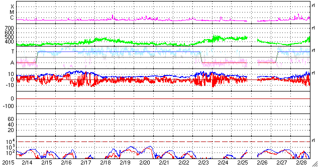 (c) 高坂雄一氏 ![]() カナダ・イエローナイフで、高坂雄一さんにより現地15〜16日の夜に撮影されたオーロラ。 (c) 高坂雄一氏 ![]() 日本の地上で観測された磁場の変化。太陽風の乱れによって、急な強まりが発生している。 (c) 気象庁地磁気観測所 ![]() Dst指数(速報値)は -221nTまで下がり、大きな規模の磁気嵐になっています。Dst指数はマイナス方向に強まります。 (c) 京都大学WDC ![]() GOES衛星の磁場南北成分の変化。太陽風の乱れにより、磁場が南向きに変化している時間帯がある。 (c) NOAA/SWPC ![]() SDO衛星のAIA193カメラによる太陽コロナの様子 (c) SDO (NASA) ![]() SDO衛星による太陽の可視光写真。マウスの矢印を写真に重ねると、黒点番号付きの写真に切り替わります。 (c) SDO (NASA) ![]() ACEが観測した太陽風の磁場(1番上の枠、白線は全体の強度、赤線は南北成分) および、太陽風の密度(3番目の橙線)、速度(4番目の黄線) (c) NOAA/SWPC ![]() リアルタイムAE指数 下段のAEグラフの値が高くなると、オーロラ活動が活発化しています。 (c) 京都大学, NICT ![]() 27日の太陽周期に合わせたデータプロット 太陽が同じ面を地球に向けていた27日前の変化から、今後を予想することができます。 (c) 作図:宇宙天気ニュース