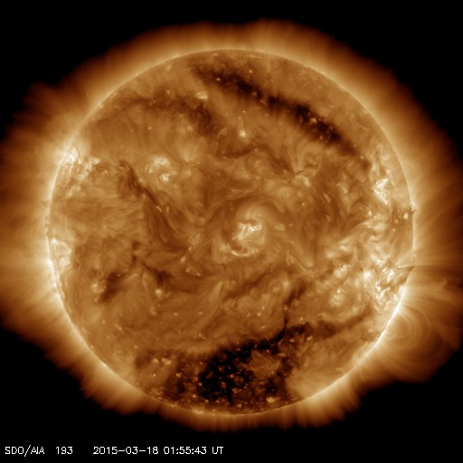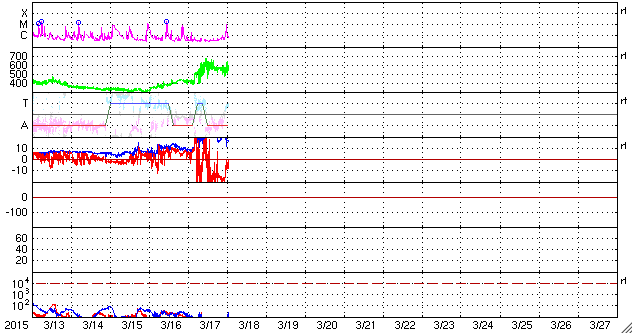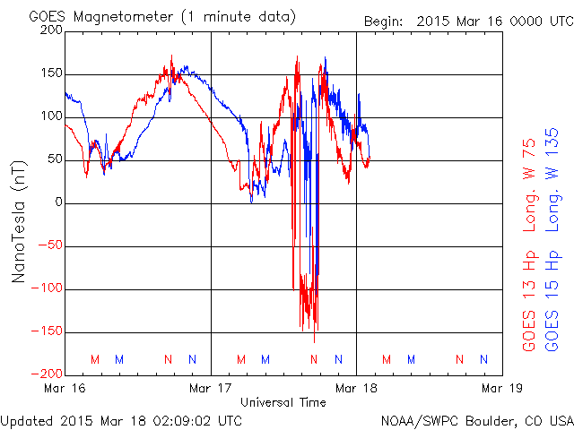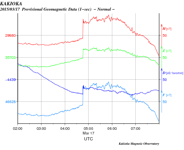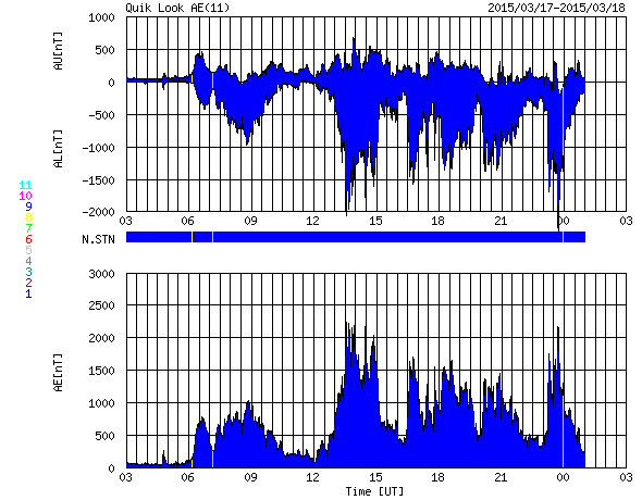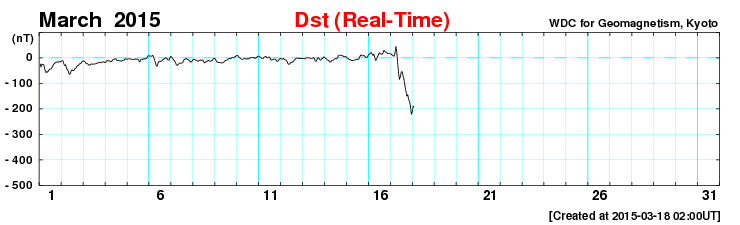 2015/ 3/18 11:09 更新 CMEによる太陽風の乱れが到来し、磁気圏が激しく乱れています。イエローナイフのオーロラをどうぞ。 担当 篠原 昨日のニュースの直後、 17日13時(世界時17日4時)に、太陽風の乱れが到来しました。 磁場が大きく南に振れて、激しい磁気圏活動を起こしています。 その報告の前に、 カナダの高坂雄一さんよりいただいた、 現地15日23時〜0時(世界時16日5〜6時)頃に、 イエローナイフで撮影された素晴らしいオーロラの写真を紹介します。 この夜は、この冬でも一二というくらい 色の豊富なオーロラが現れたそうです。 CMEの乱れがやって来る1日前のオーロラです。 太陽風のデータを見ると、 ちょうどこの頃に磁場が南に強く振れていました( -10nTくらい)。 この変化が影響した様です。 1枚目は赤い光の帯がぐるぐるとねじられたように、 2枚目は頭上からオーロラのシャワーが降り注ぐように、 どちらも息を飲むような光景です。 見事な写真をありがとうございます。 素晴らしい現象が重なっていますが、 CMEによる太陽風の乱れでは、 初めに、磁場は25nT、速度は500km/秒へ強まりました。 擾乱は17日13時45分(世界時17日4時45分)頃に地球に達し、 磁気圏を圧縮しています。 地磁気観測所の磁場データを見ると(3枚目の図)、 擾乱の始まりが、急な磁場強度の強まりとして観測されています。 太陽風磁場の南北成分は、初めは北向きに振れました。 しかし、1時間ほど経ったところで南向きに転じて、 -20nTとかなり強く振れました。 この状態が3時間ほど続いて、再び北向きに切り替わり、 その後、再度、南向きに変わって、 -20nT近い強い南向きが11時間にわたって続いています。 速度も、最高で650km/秒まで上がり、 擾乱全体で、550〜600km/秒の高速風が続いています。 この太陽風の乱れのため、磁気圏はかなり激しく乱れています。 AE指数のグラフは、2000nTを越える激しい変化が発生しています。 特に、上側のAU、ALのグラフに注目して欲しいのですが、 太くなっているグラフの帯の上端が、 活動が高まるとともに下へ下がっています。 これは、オーロラの活動領域が低緯度側へ広がってしまったためで、 こうなると、AE指数は乱れの大きさを測定できなくなってしまいます。 そして、京都大学WDCによるDst指数は、大きくマイナス側に振れて、 -221nTと激しい変化になっています。 Dst指数が -200nTを超えるのは、 現在の太陽の第24活動周期では初のことで、 前回は10年前、2005年5月15日の -247nT以来です。 Dst指数の変化としては、特別な大イベントではありませんが、 今回の第24期にとっては記録的なイベントとなっています。 この他にも面白い変化が発生しています。 静止衛星であるGOES衛星の磁場南北成分のグラフを紹介します。 静止衛星は普段は地球の磁気圏内にいるため、 磁場は北向き(プラス方向)になっています。 ところが、激しい太陽風の乱れ(特に南向きの磁場の強まり)がやって来ると、 磁気圏が押し込まれ、磁場がはぎ取られして、 静止衛星の軌道が磁気圏の外側に出てしまうことがあるのです。 今日のGOES衛星のグラフでは、 中央の部分に、磁場が南向き(マイナス方向)に振れている時間帯があります。 ここで、衛星が磁気圏から飛び出し(正しくは、磁気圏の境界が引っこんで)、 太陽風の中に入ってしまった様です。 現在の太陽風は、速度は550km/秒と高速風が続き、 磁場強度も20nT近くと強まっています。 しかし、磁場の南北成分は、今朝くらいから0nTに近づいていて、 そろそろ北向きに切り替わるかもしれません。 磁気圏の擾乱も、この辺りで一段落となりそうです。 太陽は、今朝、18日7時(世界時17日23時)に、 2297黒点群でM1.0の中規模フレアが発生しています。 X線グラフの変化は、少なくなっていて、 2297群の活動の弱まりを感じさせます。 久しぶりに、超長文になりました・・・