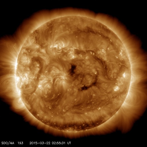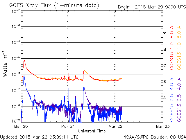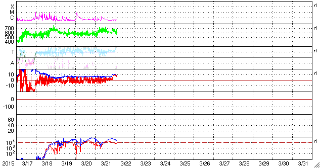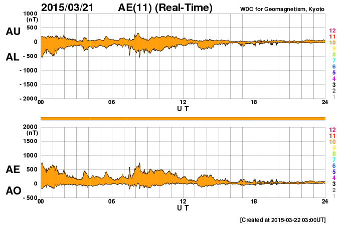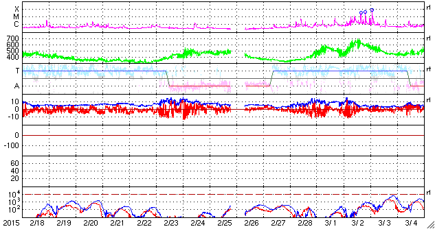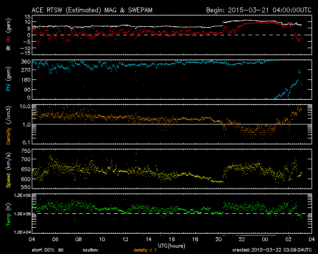 2015/ 3/22 12:09 更新 600km/秒台の高速太陽風が続いています。ニュージーランドのオーロラをどうぞ。 担当 篠原 ニュージーランド南島のダニーデンの中村太一さんより、 17日に始まった激しい磁気嵐のオーロラ写真をいただきました。 17日から3晩にわたる写真です。 1、2枚目は、擾乱が始まった17〜18日の夜のオーロラです。 中村さんによると、「爆発的」という言葉が似合う状態で、 頭上も含めて光が動き、交差しては消える圧倒的な状態だったそうです。 3枚目は18〜19日の夜で、 オーロラは、前夜よりも落ち着いた状態だったそうです。 写真の左上の光の筋は、ISS(国際宇宙ステーション)の軌跡だそうで、 眩しいくらいに輝きながら南十字を横切って行ったとのことです。 オーロラを含めた絶妙のタイミングの撮影ですね。 4、5枚目は、19〜20日の夜です。 17日に比べると高さはなくなったそうですが、 ものすごい速さの動きが夜通し見えていたそうです。 オーロラの上には、南半球ならではのマゼラン雲が輝いています。 そして、地平線の様子がすごく臨場感を与えてくれています。 美しい写真と当日のオーロラの詳しい紹介をありがとうございます。 天候にも恵まれ、すばらしい夜が続いたのですね。 太陽風は、600〜650km/秒とかなり高い速度が続いています。 磁場強度も、6nTから、今朝は10nTに強まっています。 17日に始まった太陽風の強まりは、5日間続いています。 後半は、コロナホールと関係した変化だと思います。 そして、27日周期の図を見ると、 前周期の2月24日からは弱い速度の高まりが始まっていて、 この後、更にこの変化が回帰してくる可能性があります。 なかなか興味深い状態が続いています。 太陽風の磁場の南北成分は、 ACEのグラフの後半からは、北寄りの傾向になっています。 このため、磁気圏の活動は静かになっているようで、 AE指数のグラフ(6枚目に、京都大学WDCの図を掲載しています)も、 後半は変化がなくなっています。 ACE衛星のグラフの最後では、 磁場が南向きに変わりそうな様子も見えています。 その場合、磁場がやや強まっているので、振れ幅もより大きくなって、 磁気圏の活動をより強める可能性があります。 しばらく注目して下さい。 太陽では、東端の向こう側でフレアが発生して、 C1.7の変化が記録されています。 活動的な領域がこちらに近づいているのかもしれません。 放射線帯の高エネルギー電子は、 昨日とほぼ同程度で、今日も10,000を超えています。 磁気圏の活動が静かになったことで、 今後どの様に推移するでしょうか。