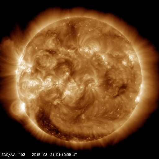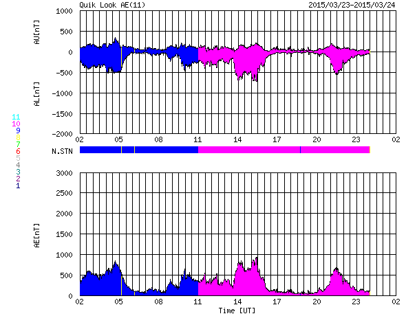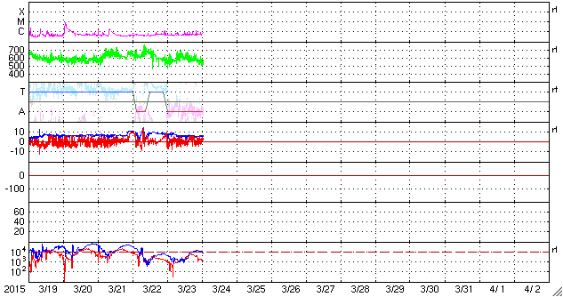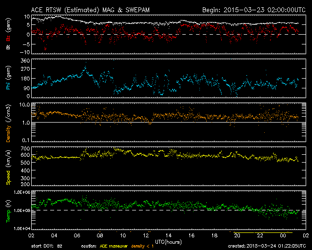 2015/ 3/24 10:22 更新 500km/秒台の高速太陽風が続いています。 担当 篠原 太陽風の速度は、昨日のニュースの後、 550km/秒から再び600km/秒台に上がりました。 今朝になって少し下がりましたが、 現在も530km/秒と高速状態が続いています。 磁場強度は、6nTと平均的な値を保っています。 27日周期の図の前周期と同様に、 太陽風の高まりはもうしばらく続くのかもしれません。 太陽風磁場の南北成分は、 小幅ですが、南向きの変化が見られます。 このため、磁気圏の活動も続いていて、 AE指数は500〜800nTの中規模の変化が繰り返し発生しています。 しかし、ACEのグラフの後半から 磁場はやや北寄りになっている印象です。 この傾向が強まると、オーロラの活動は弱まっていくでしょう。 太陽は、東端でC3.6の小規模フレアが発生していますが、 目立った活動はこの程度で、全体的には穏やかです。 今日は、羽田空港の国際ターミナルで更新しています。 これからバンコクへ向けて出発です。 土曜日まで更新が不定期になります。