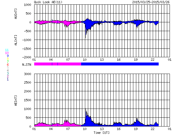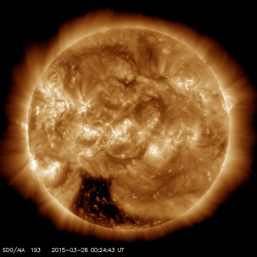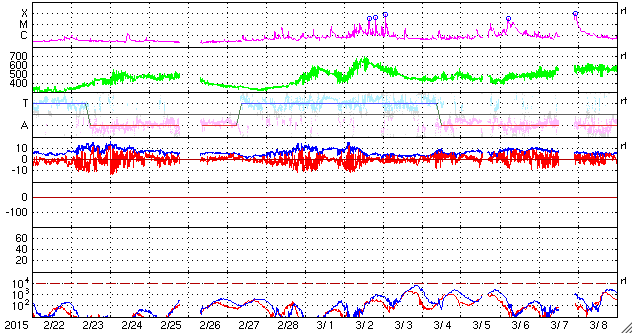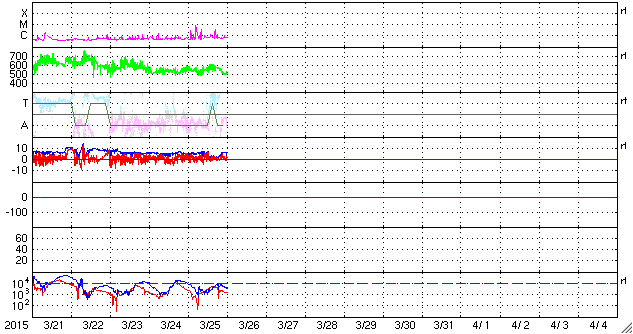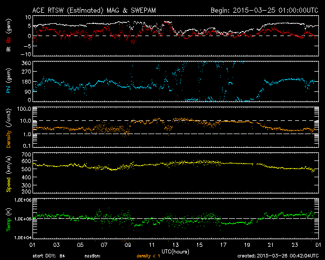 2015/ 3/26 09:43 更新 太陽風は500km/秒台の高速風が続いています。太陽でCクラスのフレアが発生しています。 担当 篠原 太陽風の速度は、昨日より550km/秒の状態が続いていましたが、 今朝、26日6時(世界時25日21時)に少し下がって、 以降は500km/秒となっています。 高速の風は続いていますが、 そろそろ終わりに近づいているのかもしれません。 太陽風の磁場強度は、グラフの途中で弱まる変化もありますが、 全体としては、5nT付近で安定しています。 磁場の南北成分は、0nTからやや北寄りに推移しています。 このため、磁気圏の活動は弱まっていて、 オーロラの活動度を表すAE指数は、 700nTの中規模の変化がひとつありますが、 他は小さい変化ばかりです。 27日周期の図を参考にすると、 太陽風の高まりは一旦終わりになりそうです。 一方、SDO衛星AIA193の太陽写真を見ると、 南半球にコロナホールが大きく広がっていて、 そろそろ太陽の中心線に達しそうです。 このため、3〜4日後くらいから次の高速太陽風が始まりそうです。 前周期のグラフでは、次の高速風は3月1日に始まっています。 しかし、今回はコロナホールの位置が少し左にずれていて、 中心線に達するのが1日くらい遅れそうです。 従って、高速風の始まりも1日遅れるとすると、 29日頃になるかもしれません。 太陽は、昨日のニュースの後から、 中央の2305黒点群の活動が高まり、 C2.6、C8.7、C3.2、C3.3など Cクラスの小規模フレアを8回ほど起こしています。 引き続き注目して下さい。 昨日の昼間は、暑かったものの比較的爽やかな空気で、 久しぶりに夏の空気を楽しんだ感じでした。 今日は、昼の便でベトナムのハノイへ向かいます。 これから荷物をまとめて、空港へ向かいます。 ![]() SDO衛星のAIA193カメラによる太陽コロナの様子 (c) SDO (NASA) ![]() SDO衛星による太陽の可視光写真。マウスの矢印を写真に重ねると、黒点番号付きの写真に切り替わります。 (c) SDO (NASA) ![]() ACEが観測した太陽風の磁場(1番上の枠、白線は全体の強度、赤線は南北成分) および、太陽風の密度(3番目の橙線)、速度(4番目の黄線) (c) NOAA/SWPC ![]() リアルタイムAE指数 下段のAEグラフの値が高くなると、オーロラ活動が活発化しています。 (c) 京都大学, NICT ![]() 27日の太陽周期に合わせたデータプロット 太陽が同じ面を地球に向けていた27日前の変化から、今後を予想することができます。 (c) 作図:宇宙天気ニュース
