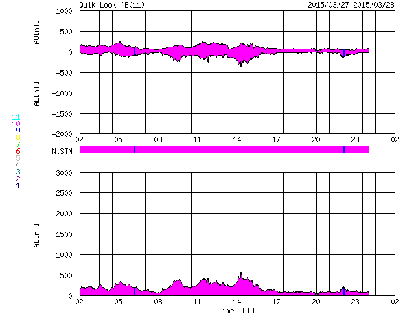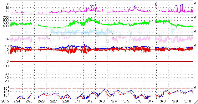 (c) SDO (NASA)、 (動画加工 : 宇宙天気ニュース) ![]() フィラメント噴出によるCMEの様子。SOHO衛星LASCO C2。 (c) SOHO (ESA & NASA)、 (動画加工 : 宇宙天気ニュース) ![]() SDO衛星のAIA193カメラによる太陽コロナの様子 (c) SDO (NASA) ![]() SDO衛星による太陽の可視光写真。マウスの矢印を写真に重ねると、黒点番号付きの写真に切り替わります。 (c) SDO (NASA) ![]() GOES衛星の太陽X線データ (c) NOAA/SWPC ![]() ACEが観測した太陽風の磁場(1番上の枠、白線は全体の強度、赤線は南北成分) および、太陽風の密度(3番目の橙線)、速度(4番目の黄線) (c) NOAA/SWPC ![]() リアルタイムAE指数 下段のAEグラフの値が高くなると、オーロラ活動が活発化しています。 (c) 京都大学, NICT ![]() 27日の太陽周期に合わせたデータプロット 太陽が同じ面を地球に向けていた27日前の変化から、今後を予想することができます。 (c) 作図:宇宙天気ニュース