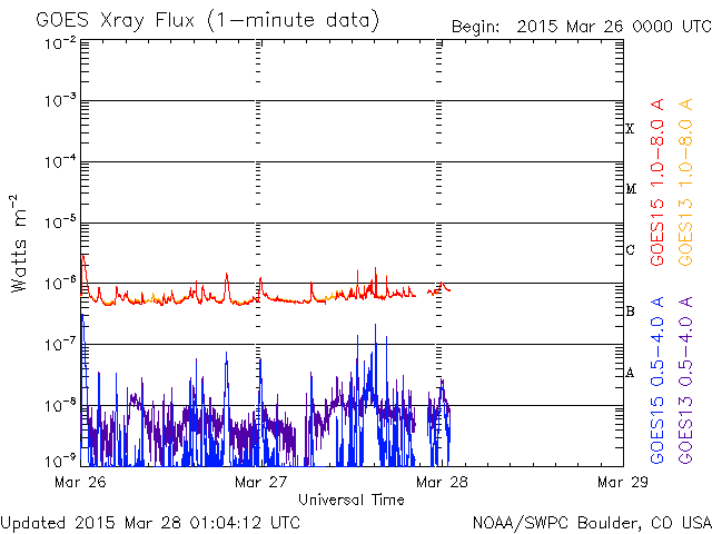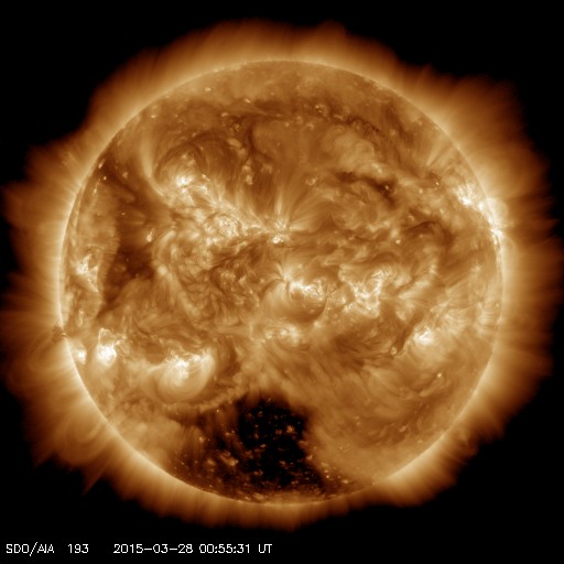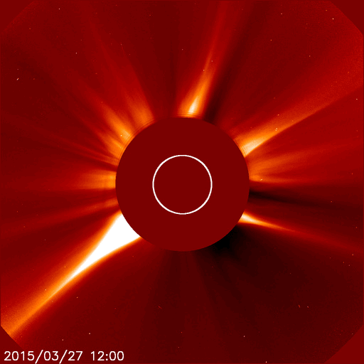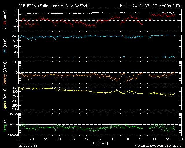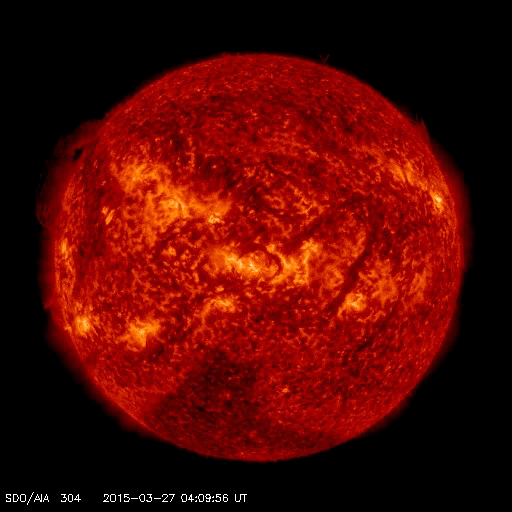 2015/ 3/28 10:04 更新 太陽風は低速風に変わっています。明日くらいから再び速度が高まりそうです。 担当 篠原 昨夜、27日22時(世界時27日13時)頃に、 太陽の北東端(左上)で、フィラメント噴出が発生しました。 SDO衛星AIA304による動画を掲載します。 太陽からコロナのガスがゆっくりと持ち上げられ、 噴き上がって行く様子が見られます。 この噴出により、CME(太陽ガスの放出現象)も発生していて、 SOHO衛星LASCO C2では、ガスがきれいに丸く広がっています。 SOHO衛星の写真が、 28日1時半(世界時17日16時半)で止まっているので、 飛び出す途中までの動画です。 CMEは地球に対して横方向に噴き出しているので、 影響はありません。 太陽では、西の端(右端)の2309黒点群で、 C1の小さいフレアが4回発生していますが、 全体としては穏やかで、X線のグラフもあまり変化がありません。 太陽風の速度は、ゆっくりと低下が続いて、 昨夜には400km/秒を割り、 現在は360km/秒と低速風に変わっています。 磁場強度は、5nTから7nTへ少し高まりましたが、 現在は6nTとやや戻しています。 27日周期の図を見ると、300km/秒台への速度の低下が、 およそ1日遅れで発生しています。 すると、速度の高まりも1日遅れで、 明日くらいから始まるのかもしれません。 SDO衛星AIA193の太陽写真を見ると、 コロナホールは太陽の中心線付近に広がっていて、 地球へ向かって高速の太陽風を吹き出しているところです。 今朝、成田空港に着きました。 そのまま羽田空港へ移動して、記事を書いています。 到着時の機内放送で気温4度と案内があり、 驚いて服を着込みました。 束の間の夏でした・・・