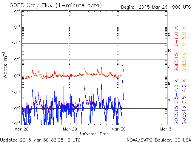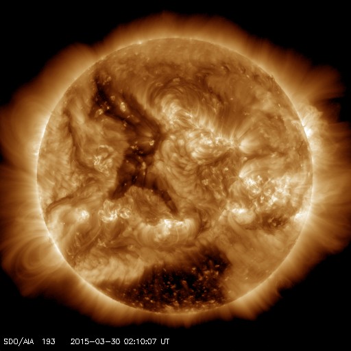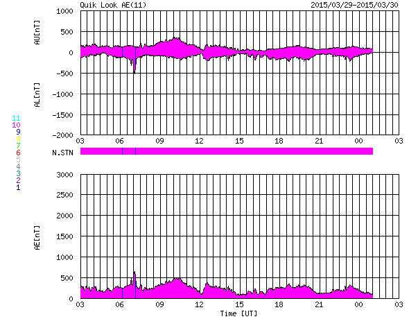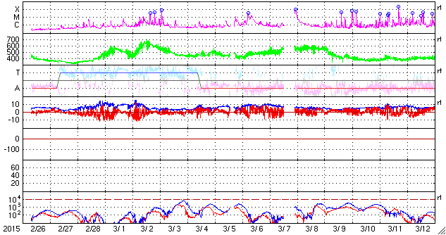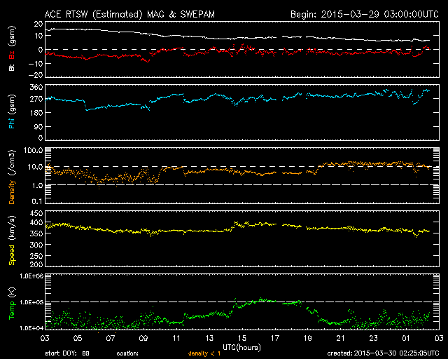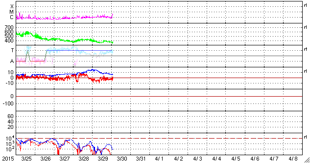2015/ 3/30 11:25 更新 太陽風は350km/秒の低速風になっています。 担当 篠原 太陽風は高まらず、 速度は400km/秒から350km/秒へ下がり、 磁場強度も15nTから6nTへ弱まっています。 今回は様子が変わっているようです。 SDO衛星AIA193を見ると、 南半球のコロナホールは西側に進み、 地球へ影響が及び始める目安の位置に達しています。 そろそろ太陽風に影響が始まっても良い頃です。 引き続き、太陽風のデータに注目して下さい。 太陽風磁場は、弱い南寄りの傾向が続いています。 磁気圏でも小規模の活動が続いている様で、 AE指数は200nT前後の弱い変化が長時間続いています。 太陽では、西の端の2303黒点群の活動度が上がり、 C3.0、C2.3、C2.7、C3.2とCクラスの小規模フレアが続き、 先ほど、30日10時半(世界時30日1時半)にも、 C4.7のフレアを起こしています。 この時は、もう西の端の向こう側に回っているので、 実際にはこれよりも規模が大きいのかもしれません。 地球からは見えなくなったので、今後の影響はありません。 ![]() SDO衛星のAIA193カメラによる太陽コロナの様子 (c) SDO (NASA) ![]() SDO衛星による太陽の可視光写真。マウスの矢印を写真に重ねると、黒点番号付きの写真に切り替わります。 (c) SDO (NASA) ![]() ACEが観測した太陽風の磁場(1番上の枠、白線は全体の強度、赤線は南北成分) および、太陽風の密度(3番目の橙線)、速度(4番目の黄線) (c) NOAA/SWPC ![]() リアルタイムAE指数 下段のAEグラフの値が高くなると、オーロラ活動が活発化しています。 (c) 京都大学, NICT ![]() 27日の太陽周期に合わせたデータプロット 太陽が同じ面を地球に向けていた27日前の変化から、今後を予想することができます。 (c) 作図:宇宙天気ニュース