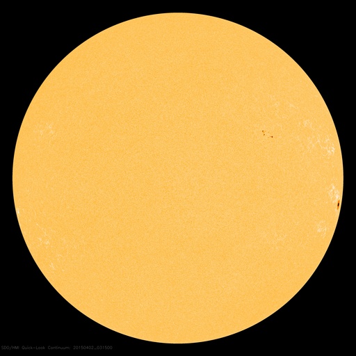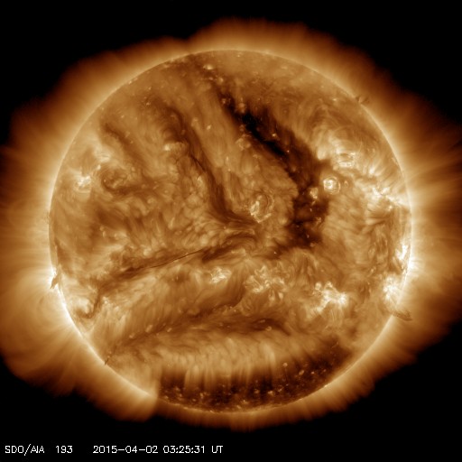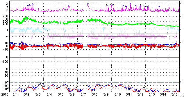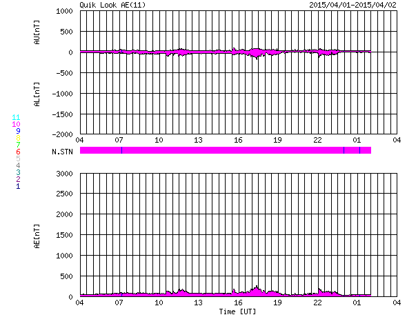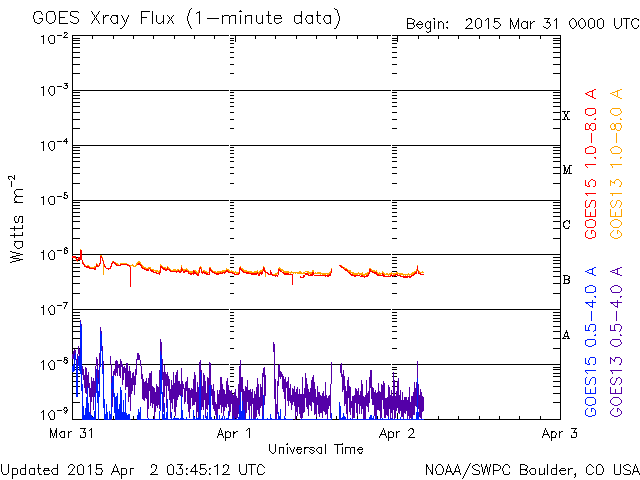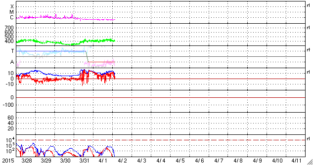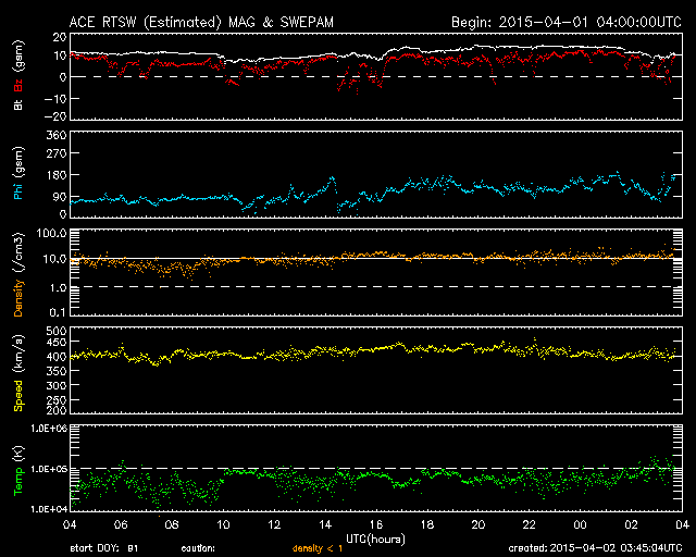 2015/ 4/ 2 12:45 更新 太陽風磁場の強まりが続いています。磁気圏は穏やかです。 担当 篠原 太陽風の磁場強度の強まりは、現在も続いています。 昨日以降、10nTから15nT近くに再び上がったりしながら、 現在も10nTと強まった状態を保っています。 太陽風の速度も、400km/秒で安定しています。 こちらは平均的な値です。 磁場の南北成分は、ほとんど北向きになっています。 このため磁気圏は静穏で、 AE指数のグラフは、小さい変化が時々見られる程度です。 SDO衛星AIA193の太陽写真では、 北半球に縦に伸びるコロナホールが太陽の西側に進み、 明日くらいから影響が及び始めるかもしれません。 前周期よりもコロナホールが目立つ様になっているので、 太陽風の変化にも注目してください。 GOES衛星のX線グラフは目立った変化がなく、 太陽の活動はとても静かです。 太陽の東端にも特に活動は見られず、 静かな状態はしばらく続くかもしれません。