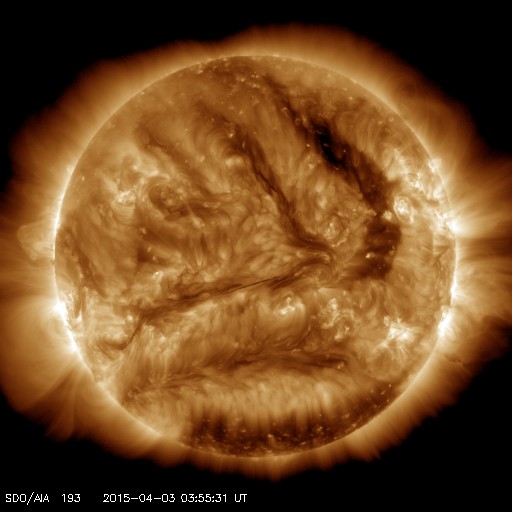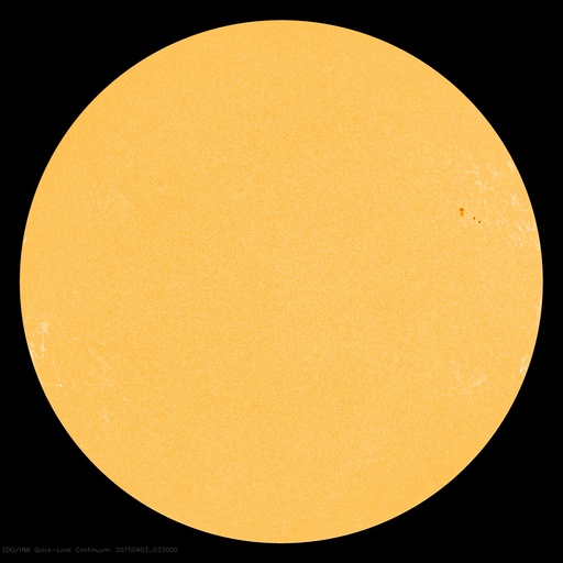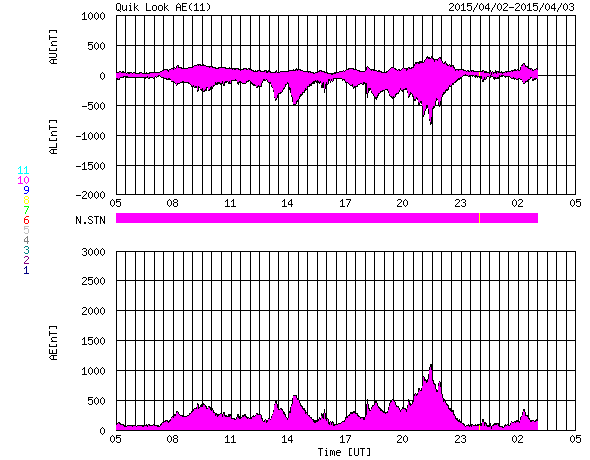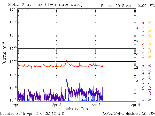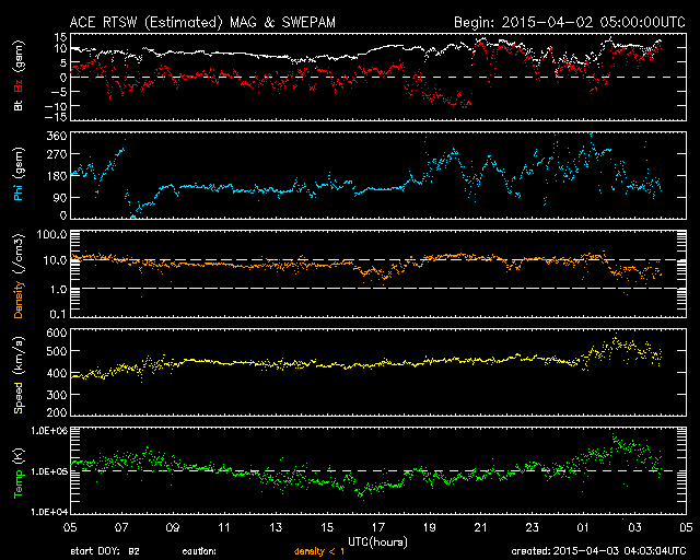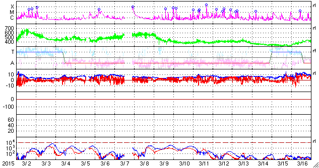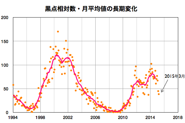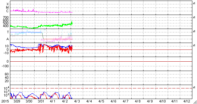 2015/ 4/ 3 13:03 更新 太陽風が500km/秒の高速風になっています。3月の黒点数は38.4でした。 担当 篠原 3月の黒点相対数の平均値が、WDC-SILSOより発表されました。 それによると、3月は 38.4 でした。 長期変化の図を、1枚目に掲載します。 2月の 44.8 に続いて、2ヶ月連続で低い値になっています。 月平均値が30台に下がったのは、2013年9月以来ですが、 この頃も、大きく下がったり、戻ったりをしています。 今月、来月とどの様に推移するのか、注目して下さい。 しかし、太陽面は今日も寂しい状態が続いていて、 黒点は、北西(右上)の2317群だけになっています。 フレアも、東端の向こう側で活動が起きただけで、 X線グラフでC1.3の変化となっています。 実際には、これよりも大きいフレアだったと思われます。 太陽風は、昨日の午後から速度を上げて、 450km/秒とやや高速の風になりました。 更に、今朝からは500km/秒へ上がっています。 SDO衛星AIA193の北半球側に見えていたコロナホールの影響が 始まった様です。 太陽風の磁場強度は、10nT前後に強まったままです。 しかし、速度が高まった今朝くらいから、 強弱の変化が目立つ様になっています。 速度の高まりとの関係で、 これから磁場は弱まっていくかもしれません。 磁場の南北成分は、 昨日のニュースの後から0nT付近で変化するようになり、 弱いながらも南向きにも振れる様になって、 磁気圏の活動もある程度高まっています。 AE指数のグラフでは、250nTの小規模の活動から、 一時的に南向き磁場が強まった影響で、 1000nTに達する大きな変化も記録されています。 コロナホールの横幅が狭いので、 太陽風速度の高まりは、 あまり長く続かないだろうと思います。