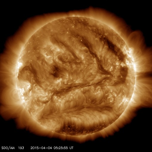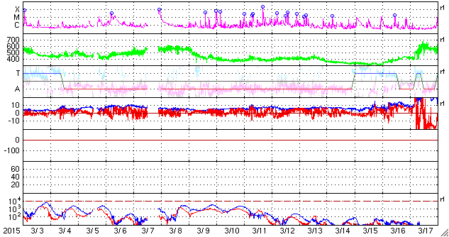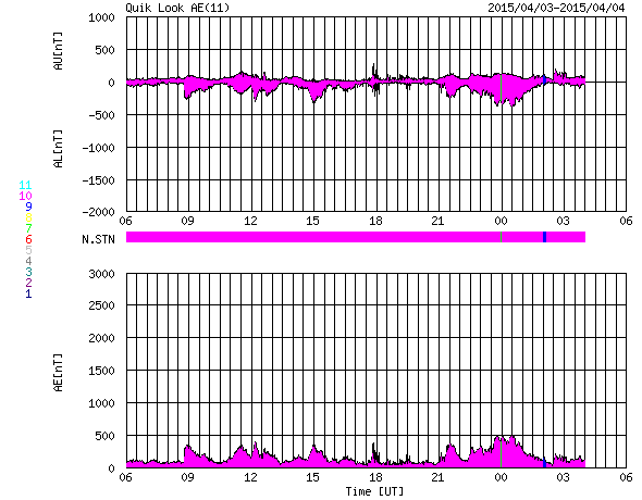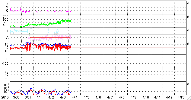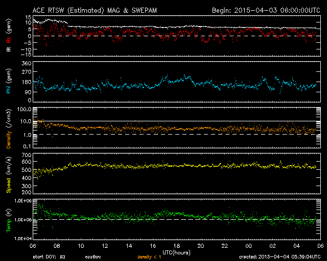 2015/ 4/ 4 14:39 更新 太陽風の速度は550km/秒に上がっています。 担当 篠原 太陽風の速度は、昨日の夕方に更に高まって、 550km/秒に上がっています。 反対に、磁場強度は5nTと平均的な強さへ下がりました。 磁場の南北成分は、 0nT付近から、やや北寄りで推移しています。 このため、磁気圏では小規模の活動が多く、 AE指数は300nTくらいの変化が続いています。 太陽は、昨日と同じように、 東端(左端)でC1.7のフレアが発生しています。 まだ向こう側にあるので、 実際の規模はこれより大きかったと思われます。 SOHO衛星LASCO C3でも、 昨日と同じ様なCMEの噴出が起きていました。 この後、どの様な活動領域が姿を現すでしょうか。 太陽のこちら側でも、 東側にぽつぽつと新しい黒点が出現していて、 少しだけですが、にぎやかさが戻っています。 いよいよ明日は入学式、明後日は始業式と、 学校に学生たちが戻って来ます。 春休み中に済ませたかった作業を慌てて行っているのですが、 ちょっと終わりそうにありません・・・ ![]() SDO衛星のAIA193カメラによる太陽コロナの様子 (c) SDO (NASA) ![]() SDO衛星による太陽の可視光写真。マウスの矢印を写真に重ねると、黒点番号付きの写真に切り替わります。 (c) SDO (NASA) ![]() ACEが観測した太陽風の磁場(1番上の枠、白線は全体の強度、赤線は南北成分) および、太陽風の密度(3番目の橙線)、速度(4番目の黄線) (c) NOAA/SWPC ![]() リアルタイムAE指数 下段のAEグラフの値が高くなると、オーロラ活動が活発化しています。 (c) 京都大学, NICT ![]() 27日の太陽周期に合わせたデータプロット 太陽が同じ面を地球に向けていた27日前の変化から、今後を予想することができます。 (c) 作図:宇宙天気ニュース