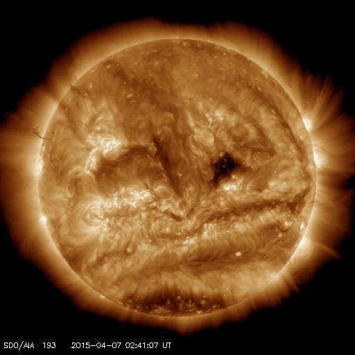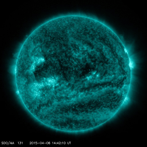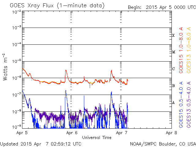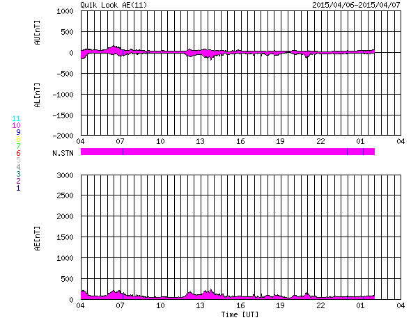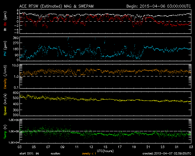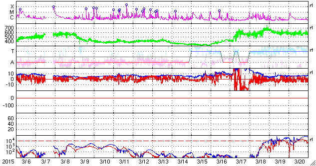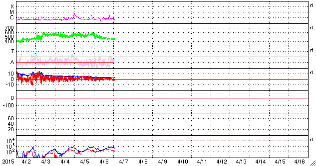 2015/ 4/ 7 12:00 更新 高速太陽風は終わり、速度は430km/秒に下がっています。 担当 篠原 太陽の中央部の2320黒点群で、 7日3時半(世界時6日18時半)に、 C3.0の小規模フレアが発生しました。 フレアの様子を、SDO衛星AIA131とAIA304の動画で紹介します。 AIA304(赤い写真)では、黒く見えるプラズマのガスが、 左下に向かって噴き出しています。 これにより、CMEも発生しているかもしれません。 規模は小規模だと思いますが、 中心部で発生しているので、 地球へ影響が及ぶ可能性があります。 今後のSOHO衛星の写真で確認できると思います。 2320群は、引き続きフレアの発生に注目して下さい。 太陽風は、ゆっくりと速度が下がり続け、 昨日の500km/秒から1日経って、 現在は430km/秒と平均的な状態に戻っています。 磁場強度も、3nTとやや弱くなっています。 太陽風速度の高まりは、4日ほど続きました。 磁気圏は穏やかで、 AE指数は小さい変化がぽつぽつと見られる程度です。 一方、太陽風磁場の南北成分を見ると、 北寄りだった傾向が、今朝から弱い南寄りに変わっています。 この状態が続くと、磁気圏でも活動が少し高まりそうです。