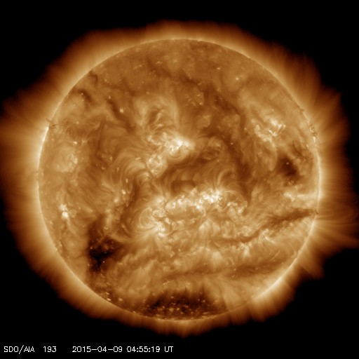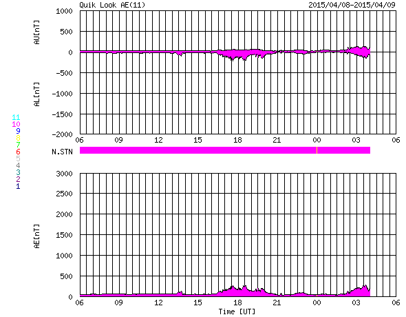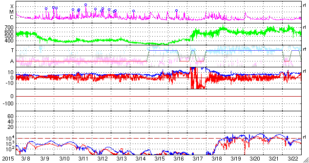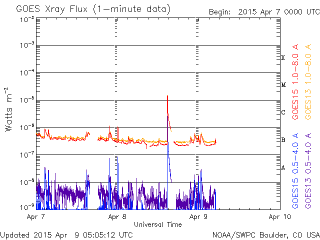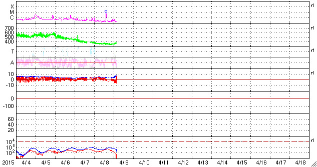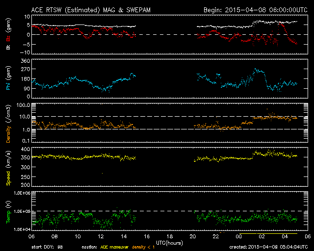 2015/ 4/ 9 14:05 更新 M1.4のフレアが発生しました。太陽風の弱い乱れが到来しています。 担当 篠原 昨夜、8日23時半(世界時8日14時半)に、 太陽の中心に達していた2320黒点群で、 M1.4の中規模フレアが発生しました。 いきなり発生した印象で、 X線のグラフは、このフレアの前後ともに穏やかです。 太陽風は、350km/秒の低速風が続いていましたが、 今朝、9日10時(世界時9日1時)に、小さい変化が到来して、 速度は370km/秒に、磁場強度は3nTから7nTに、 それぞれ少しだけ高まっています。 フィラメント噴出によるCMEの乱れが到来したのかもしれません。 太陽風磁場の南北成分は、グラフの前半は北寄りでしたが、 後半から南寄りに変わっています。 しかし、振れ幅は小さく、速度も遅めのため、 磁気圏への影響は小さい様で、 AE指数のグラフは、200nTくらいの小さい変化が見られる程度です。 SDO衛星AIA193では、目立ったコロナホールもなく、 穏やかな状態が続きそうです。 ![]() SDO衛星のAIA193カメラによる太陽コロナの様子 (c) SDO (NASA) ![]() SDO衛星による太陽の可視光写真。マウスの矢印を写真に重ねると、黒点番号付きの写真に切り替わります。 (c) SDO (NASA) ![]() GOES衛星の太陽X線データ (c) NOAA/SWPC ![]() ACEが観測した太陽風の磁場(1番上の枠、白線は全体の強度、赤線は南北成分) および、太陽風の密度(3番目の橙線)、速度(4番目の黄線) (c) NOAA/SWPC ![]() リアルタイムAE指数 下段のAEグラフの値が高くなると、オーロラ活動が活発化しています。 (c) 京都大学, NICT ![]() 27日の太陽周期に合わせたデータプロット 太陽が同じ面を地球に向けていた27日前の変化から、今後を予想することができます。 (c) 作図:宇宙天気ニュース
