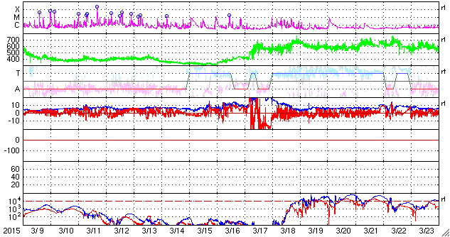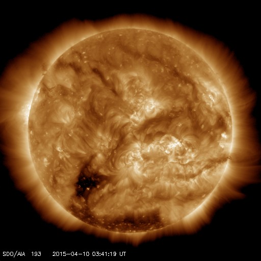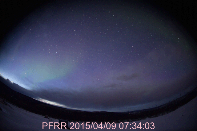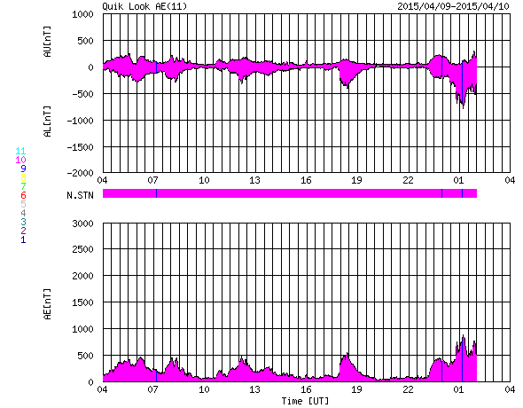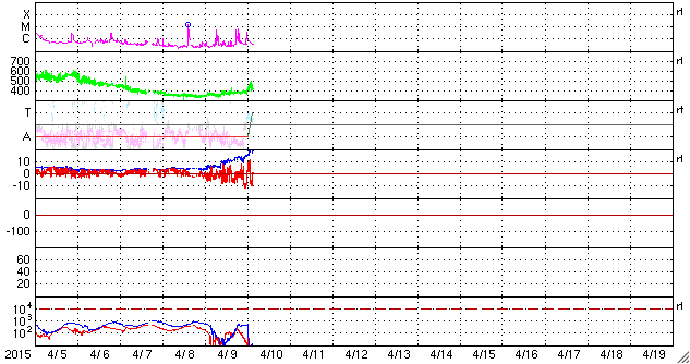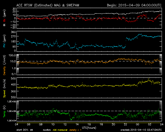 2015/ 4/10 12:48 更新 太陽風磁場が大きく強まっています。Cクラスフレアの発生が続いています。 担当 篠原 昨夜、9日18時(世界時9日9時)から、 太陽風の磁場が強まり始め、 現在、20nTに大きく強まっています。 ACE衛星のグラフでは、緩やかな変化のため目立ちませんが、 27日周期の図で全体を見ると、 変化がだいぶ大きいことが分かります。 太陽風の速度は、380km/秒とやや低速の状態が続いていましたが、 今朝になって一段上がり、430km/秒前後になっています。 磁場の南北成分は、比較的南寄りで推移しています。 ACEのグラフの縦幅が大きくなったので、 変化が見にくくなっていますが、 -5nT程度の南向きが続き、 今朝からは -10nTに達する強まりも起きています。 このため、磁気圏の活動も高まっていて、 AE指数は、500nTの変化が続き、 最後は、800nTの変化も起きています。 この活発な活動の様子を、 アラスカ、フェアバンクスの近郊のPoker Flatで 情報通信研究機構のカメラにより撮影された動画で紹介します。 表示の時刻は世界時で、暗くなった世界時9日7時半から、 明るくなる12時までの、2分間隔の撮影です。 後半にかけて、輝きがにぎやかになっていく様子が美しいです。 太陽風の強まりがどう変わっていくのか、 今後の様子に注目して下さい。 一方、太陽でも2320黒点群の活動が強まり、 フレアの発生が続いています。 9日15時半(世界時6時半)のC5.4に始まり、 C1.6、C5.9、C6.2、C3.3と、 小規模フレアが5回起きています。 こちらも、今後どの様に推移するでしょうか。 ![]() アラスカ、フェアバンクス近くのPoker Flatで撮影されたオーロラの様子。 (c) 情報通信研究機構、(動画加工 : 宇宙天気ニュース) ![]() SDO衛星のAIA193カメラによる太陽コロナの様子 (c) SDO (NASA) ![]() SDO衛星による太陽の可視光写真。マウスの矢印を写真に重ねると、黒点番号付きの写真に切り替わります。 (c) SDO (NASA) ![]() ACEが観測した太陽風の磁場(1番上の枠、白線は全体の強度、赤線は南北成分) および、太陽風の密度(3番目の橙線)、速度(4番目の黄線) (c) NOAA/SWPC ![]() リアルタイムAE指数 下段のAEグラフの値が高くなると、オーロラ活動が活発化しています。 (c) 京都大学, NICT ![]() 27日の太陽周期に合わせたデータプロット 太陽が同じ面を地球に向けていた27日前の変化から、今後を予想することができます。 (c) 作図:宇宙天気ニュース