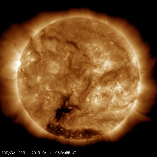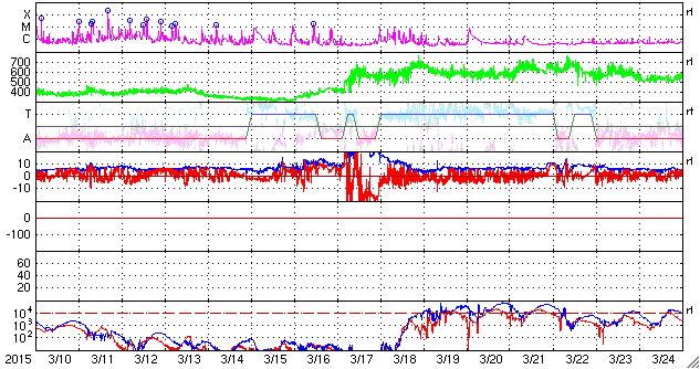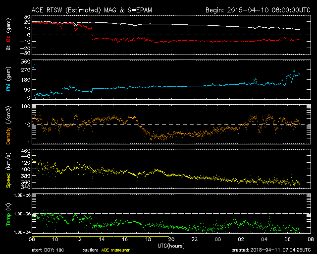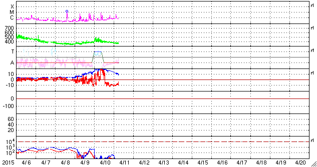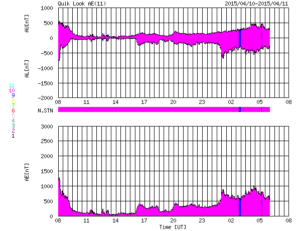 2015/ 4/11 16:05 更新 太陽風磁場の強まりが続き、磁気圏の活動も高まっています。 担当 篠原 昨日のニュースの後、 太陽風磁場の南北成分は、北向きになりました。 磁場強度は20nTに強まった状態が続き、 南北成分も北向きの +20nTまで高まりましたが、 磁気圏への影響は小さく、 AE指数のグラフもこの間は変化が小さくなっています。 そして、10日22時(世界時10日13時)から、 磁場が南向きに切り替わり、 -5nTから、やがて-10nTに南向き成分が強まっています。 これとともに、磁気圏の活動も高まって、 AE指数は、初めは400nT、 その後、800nT前後の中規模の変化になっています。 太陽風の磁場強度は、南向きに変わった頃から弱まり始め、 現在も強まった状態ですが、10nTくらいに下がっています。 乱れは終わりに近づいているようです。 この間、太陽風の速度は、 420km/秒から360km/秒へゆっくりと低下しています。 全体としては、小幅の変化です。 太陽は、西側に回っている2320黒点群で、 C7.9、C2.9、C2.8、C2.7と、小規模のフレアが発生しています。 活動的な状態はまだ保っている様です。 また、東の端から新しい黒点群が顔を出し、 C4.7の小規模フレアを起こしています。 NOAAの報告では、2321黒点群と番号が付けられています。