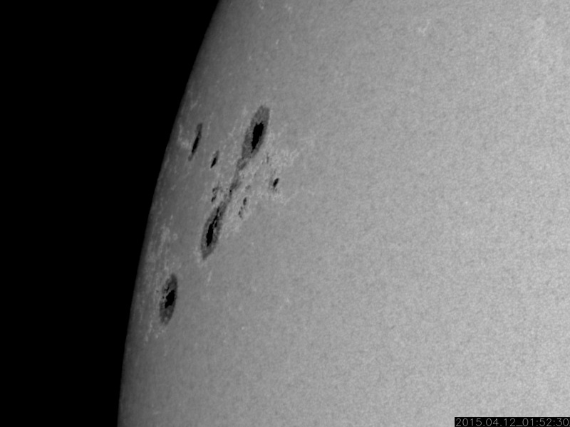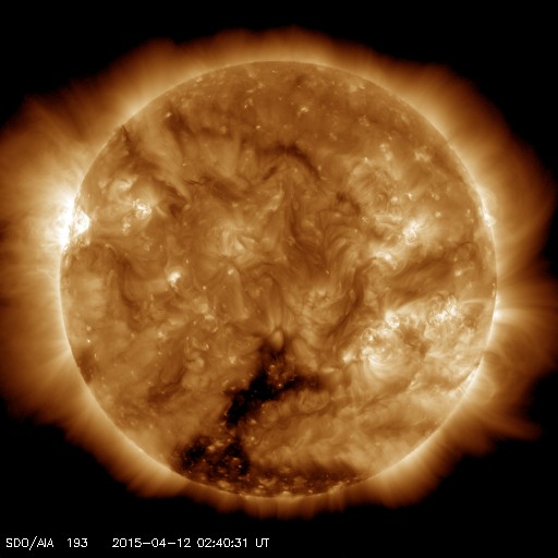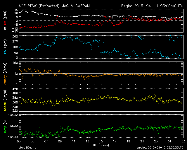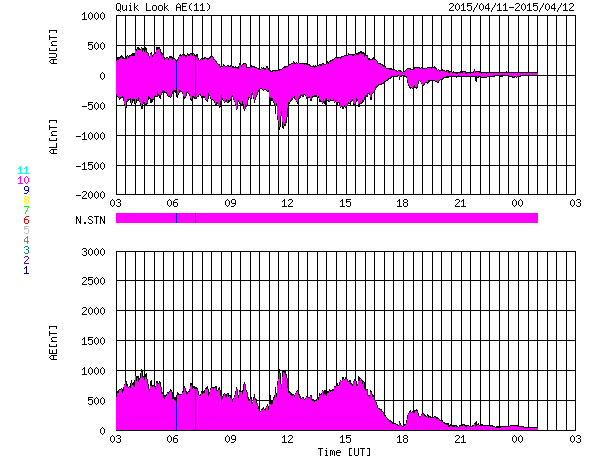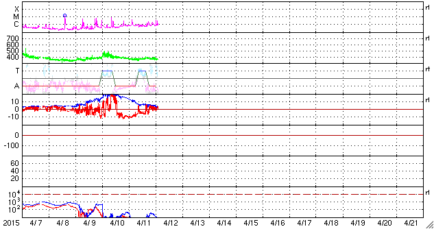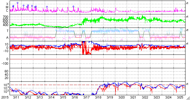 2015/ 4/12 11:51 更新 太陽風磁場の強まりは終わり、磁気圏も静穏になりました。 担当 篠原 9日に始まった太陽風磁場の強まりは、 昨日のニュースの頃は、まだ10nTくらいありましたが、 夜には5nTに下がり、 今朝からは更に下がって、3nTとむしろ弱まっています。 太陽風の速度は安定していて、 370km/秒前後とやや低速の状態です。 磁場の南北成分は、振幅は弱まりましたが、 昨日いっぱいは南向きに振れていました。 このため、AE指数も、 前半は500〜1000nTの中規模の変化が続いています。 そして、今日に入った頃から、 磁場は0nTからやや北寄りに振れる様になり、 AE指数の変化も後半はなくなっています。 太陽風の乱れはこれで一段落です。 一旦落ち着いて、 次は、SDO衛星AIA193の中心部南側に見える コロナホールの影響に注目して下さい。 明後日くらいから、太陽風に変化が見られるかもしれません。 太陽は、昨日東端から見え始めた2321黒点群が、 更に大きな姿を現しています。 SDO衛星による拡大写真を掲載します。 C4.7を最大に、Cクラスのフレアを4回ほど起こしています。 今後の活動に注目してください。