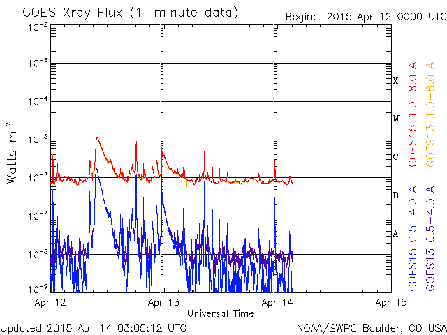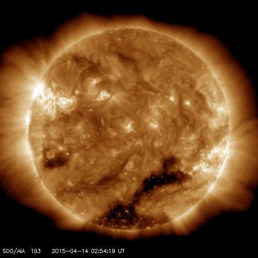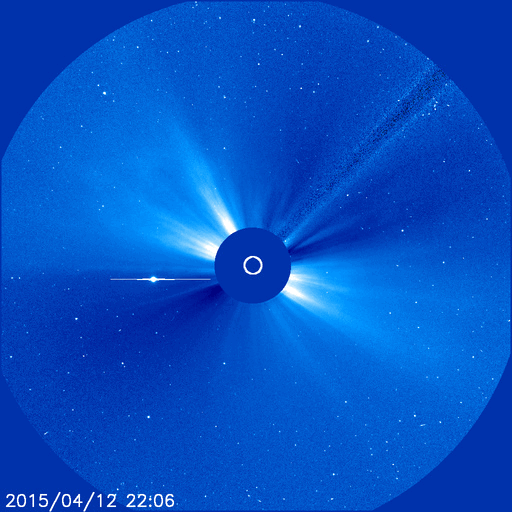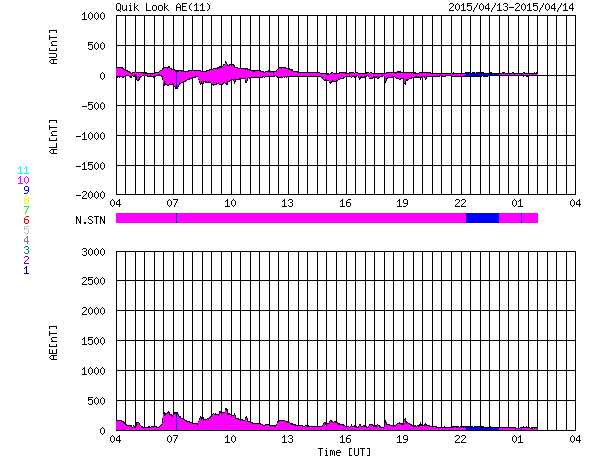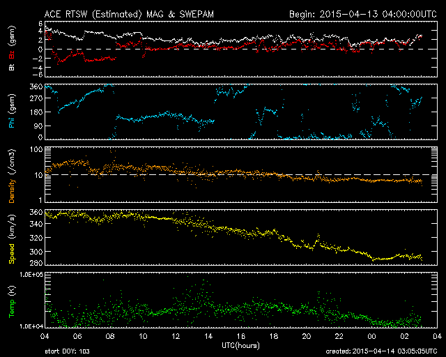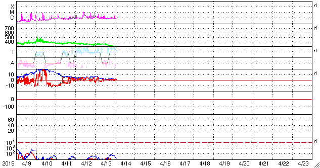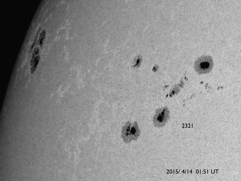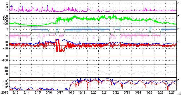 2015/ 4/14 12:06 更新 太陽の東端から新しい黒点が現れています。太陽風はかなり低速です。 担当 篠原 昨日、13日8時半(世界時12日23時半)に、 太陽の西の端(右端)近くの2320黒点群で発生した C6.4の小規模フレアに伴って、 CME(太陽ガスの放出現象)が噴出しています。 SOHO衛星LASCO C3による動画を掲載します。 太陽から右に向かって噴き出しているので、 地球への影響はなさそうです。 太陽では、この2320黒点群で、 C4.3、C1.9、C2.3、C1.4、C2.9とフレアが続いています。 また、2321黒点群に続いて、 大型の黒点が東端から姿を現しています。 SDO衛星による拡大写真を掲載します。 2321群のフレアの発生は止まっていますが、 新しい黒点群の活動はどうでしょうか。 太陽風は、昨夜から更に大きく速度が低下し、 今朝、14日9時(世界時14日0時)には、300km/秒を割りました。 現在は290km/秒とかなり遅い状態です。 太陽風は磁場強度も弱まっていて、 昨夜以降、2nT前後で推移しています。 磁気圏も静穏で、AE指数は小さい変化が前半に見られる程度です。 太陽風が弱まってきた後半は、更に静かになっています。 SDO衛星AIA193の太陽写真の南半球に見える、 コロナホールによる太陽風の強まりが始まりそうなタイミングですが、 その前に、太陽風は弱まっていきました。 今後の変化に注目してください。 ![]() 太陽の右側へ噴出するCMEの様子。SOHO衛星LASCO C3。 (c) SOHO (ESA & NASA)、 (動画加工 : 宇宙天気ニュース) ![]() 太陽の東端の2321黒点群。SDO衛星。 (c) SDO (NASA)、作図:宇宙天気ニュース ![]() SDO衛星のAIA193カメラによる太陽コロナの様子 (c) SDO (NASA) ![]() SDO衛星による太陽の可視光写真。マウスの矢印を写真に重ねると、黒点番号付きの写真に切り替わります。 (c) SDO (NASA) ![]() GOES衛星の太陽X線データ (c) NOAA/SWPC ![]() ACEが観測した太陽風の磁場(1番上の枠、白線は全体の強度、赤線は南北成分) および、太陽風の密度(3番目の橙線)、速度(4番目の黄線) (c) NOAA/SWPC ![]() リアルタイムAE指数 下段のAEグラフの値が高くなると、オーロラ活動が活発化しています。 (c) 京都大学, NICT ![]() 27日の太陽周期に合わせたデータプロット 太陽が同じ面を地球に向けていた27日前の変化から、今後を予想することができます。 (c) 作図:宇宙天気ニュース