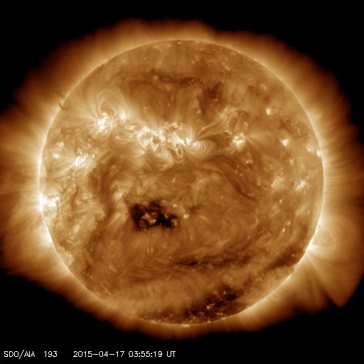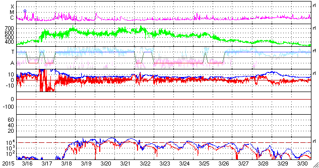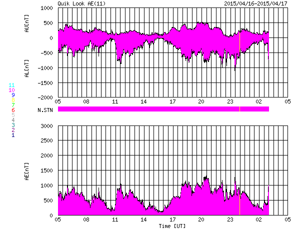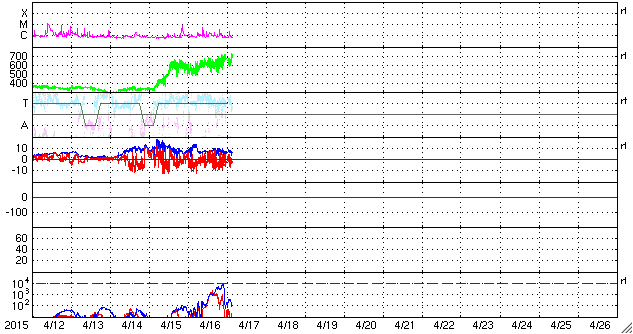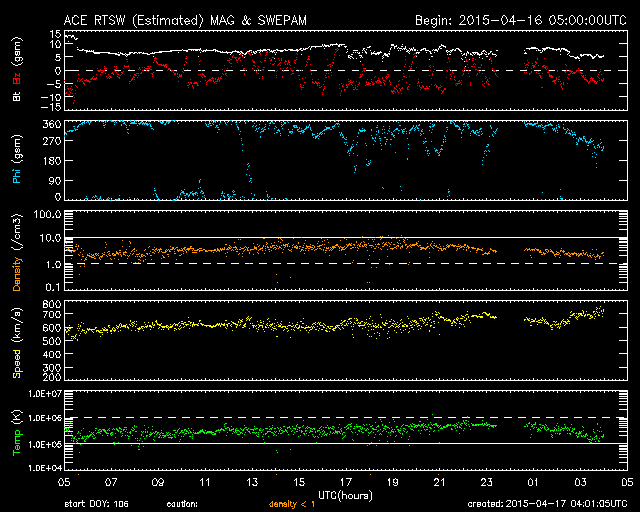 2015/ 4/17 13:04 更新 太陽風の速度は700km/秒に上がり、磁気圏の活動も活発です。ニュージーランドのオーロラをどうぞ。 担当 篠原 ニュージーランドの米戸 実さんより、 現地15日から16日の夜のオーロラ写真をいただきました。 撮影は、世界時15日13時45分とのことで、 昨日のニュースで、太陽風の速度が600km/秒へ高まり、 磁場が南向きに -10nT と大きく振れていた頃のオーロラです。 磁気圏の活動が強まって、 オーロラの領域が低緯度側に広がっていったのです。 低い所の緑色から高い所の赤色まで縦の変化がとても良く見えています。 赤いオーロラのすぐ上には、大小のマゼラン雲も見えています。 湖面に映るオーロラの色もとても美しいですね。 クイーンズタウンでは、4月中旬に積雪があったそうで、 米戸さんによると、この時期の積雪は、 過去30年間なかったことだそうです。 オーロラを撮影した夜も、氷点下の冷え込みだったそうです。 素晴らしい発色の写真をどうもありがとうございます。 太陽風は、昨日の午後に再び速度が高まって、 600klm/秒台の高速風に戻りました。 更に、今朝になるともう一段高まって、 現在は700km/秒とかなり高い速度になっています。 磁場強度も、昨日の10nTからは少し下がりましたが、 5nTから8nTの間で変化していて、やや強い状態を保っています。 磁場の南北成分は、比較的南寄りに推移しています。 速度が高まっていることもあり、 磁気圏の活動は活発に続いて、 AE指数は、1000nTを前後する大きな変化が連続しています。 27日周期の図では、 前周期も3月17日から高速の太陽風が続いています。 ただし、この時はCMEによる太陽風の強まりから変化が始まって、 途中からコロナホールの影響に変わっていました。 今回の変化から、その様子も想像することができそうです。 一方、前周期は3月25日まで500km/秒を越える高速風が続いています。 今回はどこまで継続するでしょうか。 太陽は、2321黒点群で、C2.0、C2.3、C2.0、C1.8、 2324群で、C5.7、C1.4、 そして、2325黒点群で、C3.3、C2.6と、 小規模フレアがにぎやかに発生しています。 また、東端から新しい黒点が顔を出しています。