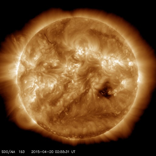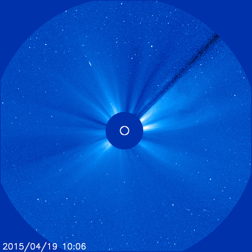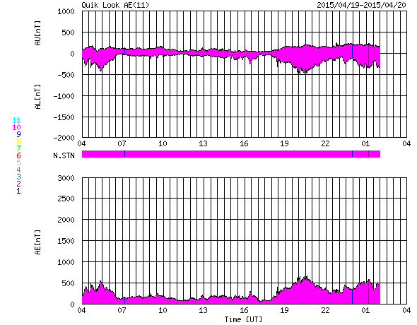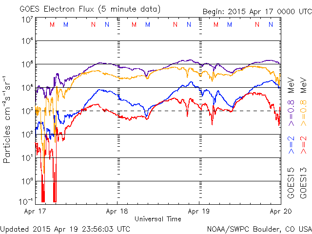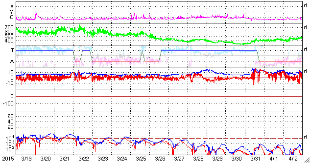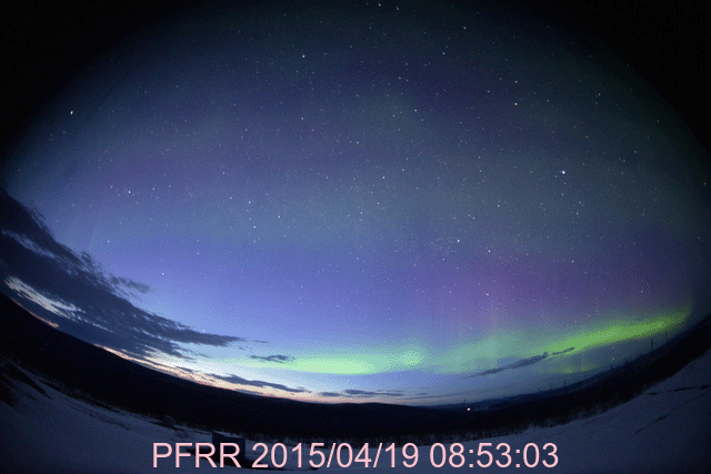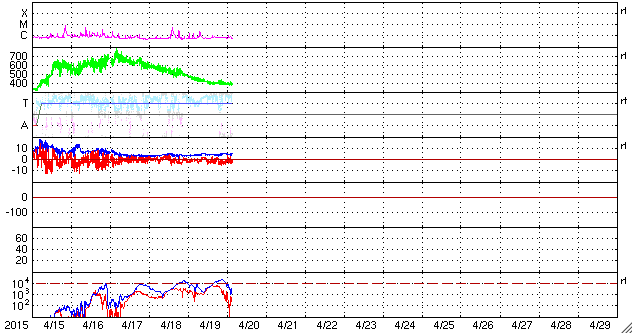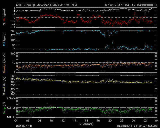 2015/ 4/20 12:14 更新 太陽風は平均的な速さに戻っています。磁気圏はやや活動的です。 担当 篠原 太陽の南東側(左下)から、 CME(太陽ガスの放出現象)が飛び出しています。 SDO衛星では特に変化が見られないので、 太陽の向こう側で発生した現象の様です。 太陽のこちら側は、 C1〜2の小さいフレアが起きた程度で穏やかです。 太陽風の速度(ACEの図の黄色線)は、 450km/秒からもう一段下がって、 400km/秒と平均的な速さになっています。 磁場強度(白線)は、4〜5nTで安定しています。 高速太陽風は通り過ぎて、穏やかな風に戻っています。 太陽風磁場の南北成分(赤線)は、 南寄り(マイナス方向)の変化が続いています。 このため、磁気圏の活動も続いていて、 AE指数は、500nT程度の高まりが数回発生しています。 AE指数の変化が大きい時間帯ではありませんが、 世界時9日9〜11時のアラスカ・フェアバンクスの オーロラの動画を掲載します。 地平線付近に薄明の残る空に、オーロラが輝いています。 4月10日のニュースでも、 このフェアバンクスのオーロラの動画を紹介したのですが、 たった10日で、夜の時間が短くなり、 夜空に明るさが残る様子を見ることができます。 ぜひ見比べて下さい。 放射線帯の高エネルギー電子は、今日も高い値に達しています。 しかし、磁気圏活動の影響で、 明日は減少しているかもしれません。 ![]() 太陽の南東方向にCMEが噴出しています。SOHO衛星LASCO C3。 (c) SOHO (ESA & NASA)、 (動画加工 : 宇宙天気ニュース) ![]() アラスカ、フェアバンクス近くのPoker Flatで撮影されたオーロラ。 (c) 情報通信研究機構、(動画加工 : 宇宙天気ニュース) ![]() SDO衛星のAIA193カメラによる太陽コロナの様子 (c) SDO (NASA) ![]() SDO衛星による太陽の可視光写真。マウスの矢印を写真に重ねると、黒点番号付きの写真に切り替わります。 (c) SDO (NASA) ![]() GOES衛星の太陽X線データ (c) NOAA/SWPC ![]() ACEが観測した太陽風の磁場(1番上の枠、白線は全体の強度、赤線は南北成分) および、太陽風の密度(3番目の橙線)、速度(4番目の黄線) (c) NOAA/SWPC ![]() リアルタイムAE指数 下段のAEグラフの値が高くなると、オーロラ活動が活発化しています。 (c) 京都大学, NICT ![]() 27日の太陽周期に合わせたデータプロット 太陽が同じ面を地球に向けていた27日前の変化から、今後を予想することができます。 (c) 作図:宇宙天気ニュース