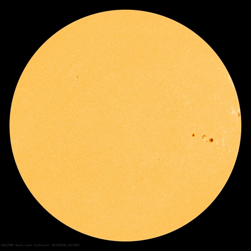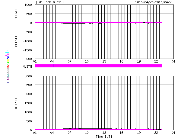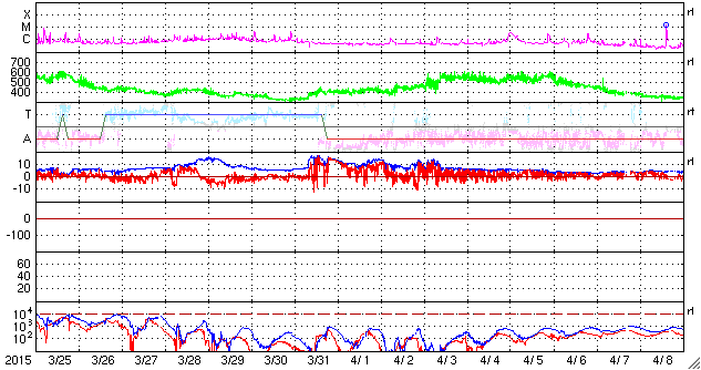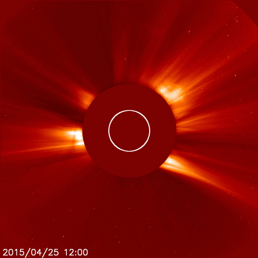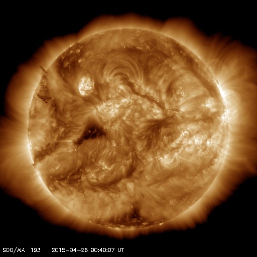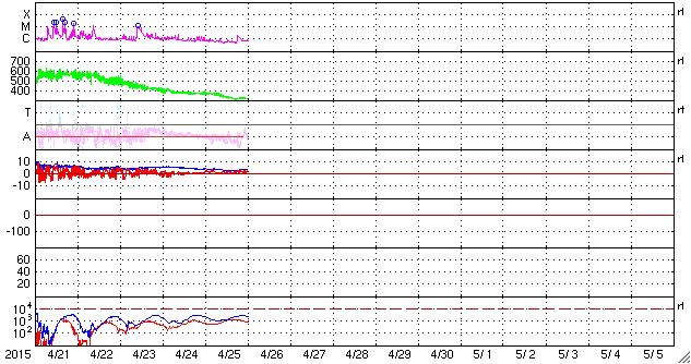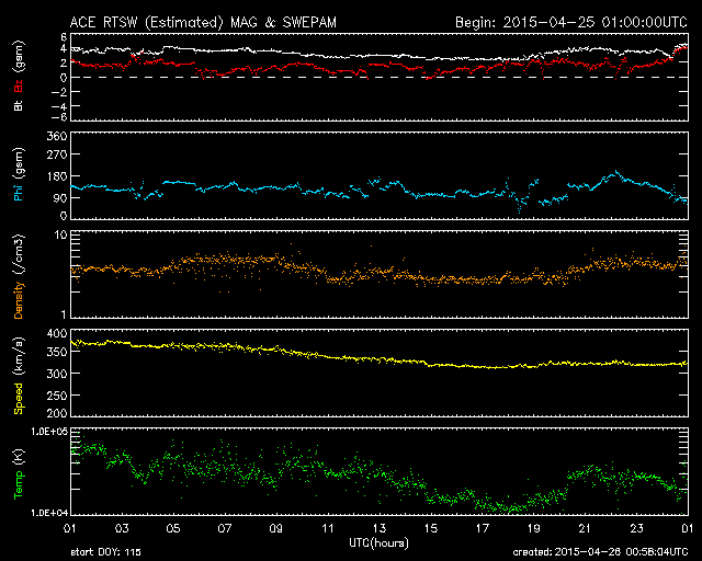 2015/ 4/26 09:59 更新 太陽の反対側でCMEが発生しました。太陽風は低速で、磁気圏も静かです。 担当 篠原 26日0時(世界時25日15時)に、 太陽全体を囲むように広がっていくハロー型のCMEが発生しました。 SDO衛星によると、太陽のこちら側では特に変動は起きていないので、 太陽の向こう側で発生した擾乱の様です。 太陽の向こう側に回り込んだ活動的な領域が、 その後も活発にフレアを起こしているのではないでしょうか。 GOES衛星のX線グラフでは、 26日3時(世界時15日18時)に、C1.9の小規模フレアが発生していますが、 これも西の端(右端)の向こう側で発生した現象で、 実際にはこれよりも規模の大きい活動だったと思われます。 CMEも噴き出している様ですが、SOHO衛星の写真はまだありません。 太陽のこちら側は静かで、この後のデータは穏やかになりそうです。 太陽風の速度は、370km/秒から320km/秒へ更に下がり、 より低速の太陽風になっています。 磁場強度は、4nTで安定しています。 磁場の南北成分は、北向きで推移しています。 磁気圏の活動は穏やかで、 AE指数は全く変化していません。 太陽風は、しばらく穏やかに推移しそうです。