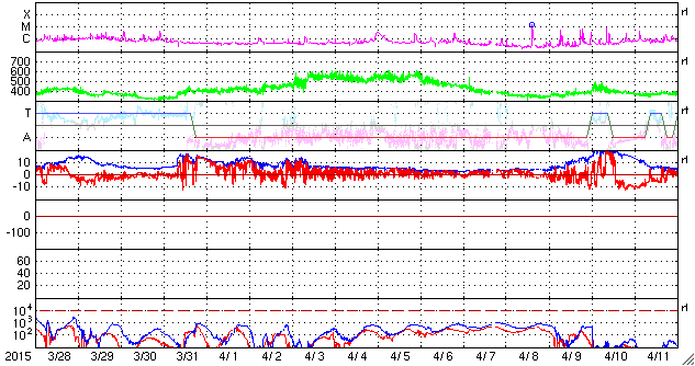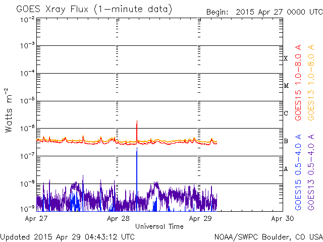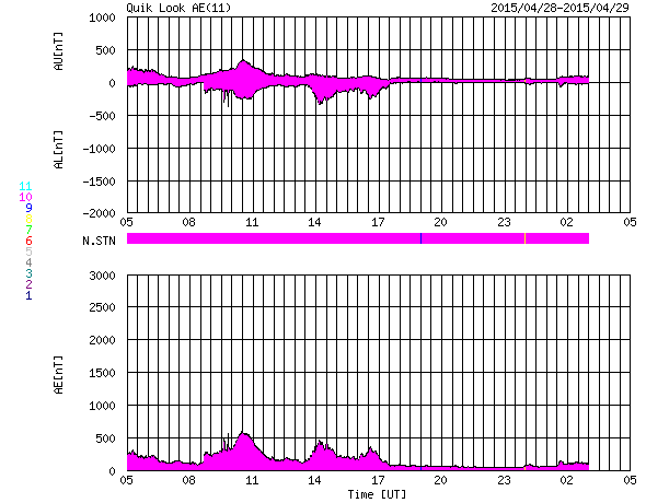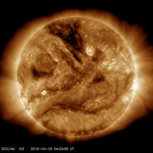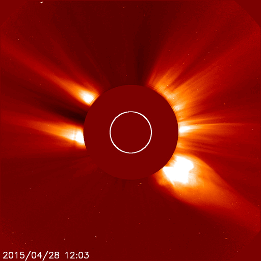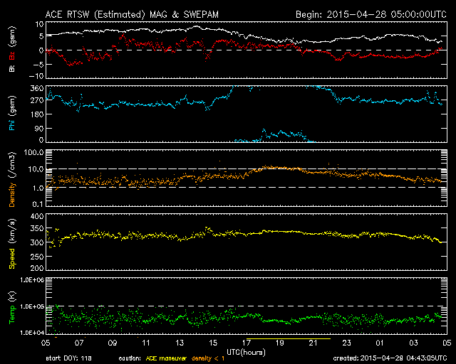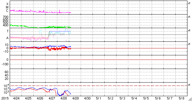 2015/ 4/29 13:44 更新 太陽の北東部でフィラメント噴出が発生し、CMEも発生しています。 担当 篠原 昨日のSDO衛星AIA193の太陽写真でも目立っていた、 太陽の北東側(左上)に長く伸びていたダークフィラメントが、 昨夜、28日22時(世界時28日13時)から噴出しました。 SDO衛星AIA193の動画を掲載します。 斜めに伸びる黒い筋が、ふわっと浮かび上がり、 太陽から飛び出して行きます。 その後、太陽側のコロナにも大きな乱れが発生しています。 この噴出によって、CME(太陽ガスの放出現象)が 太陽の左に向かって飛び出しています。 SOHO衛星LASCO C2、C3による動画を2枚目に掲載します。 フィラメントの捻れた様な白い筋が噴き出していて、見事です。 地球に対して横方向に噴き出している様なので、 地球への影響は小さそうです。 4〜5日後くらいの太陽風に、 小規模の変化が発生するかもしれません。 SOHO衛星の動画では、右下にもCMEが飛び出しています。 SDO衛星で対応する現象が見られないので、 太陽の裏側で発生したCMEではないかと思います。 一方、太陽のフレアの活動は、 西の端でC1.9の小さいフレアが起きたくらいで、穏やかです。 太陽風は、速度が330km/秒から300km/秒へ下がり、 かなり遅い風になっています。 磁場強度も、3〜5nTとやや弱い値になっています。 磁気圏では、AE指数で300〜500nTの小規模の変化が 時々発生していますが、 全体としては穏やかです。 ![]() 太陽の北東に向かってフィラメント噴出が発生しました。SDO衛星AIA193。 (c) SDO (NASA)、(動画加工 : 宇宙天気ニュース ) ![]() 太陽の左に向かって噴出するCME。SOHO衛星LASCO C2、C3。 (c) SOHO (ESA & NASA)、(動画加工 : 宇宙天気ニュース) ![]() SDO衛星のAIA193カメラによる太陽コロナの様子 (c) SDO (NASA) ![]() SDO衛星による太陽の可視光写真。マウスの矢印を写真に重ねると、黒点番号付きの写真に切り替わります。 (c) SDO (NASA) ![]() GOES衛星の太陽X線データ (c) NOAA/SWPC ![]() ACEが観測した太陽風の磁場(1番上の枠、白線は全体の強度、赤線は南北成分) および、太陽風の密度(3番目の橙線)、速度(4番目の黄線) (c) NOAA/SWPC ![]() リアルタイムAE指数 下段のAEグラフの値が高くなると、オーロラ活動が活発化しています。 (c) 京都大学, NICT ![]() 27日の太陽周期に合わせたデータプロット 太陽が同じ面を地球に向けていた27日前の変化から、今後を予想することができます。 (c) 作図:宇宙天気ニュース