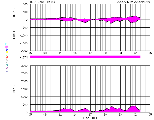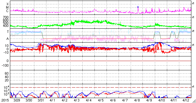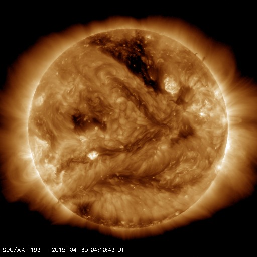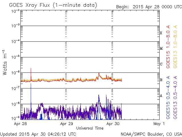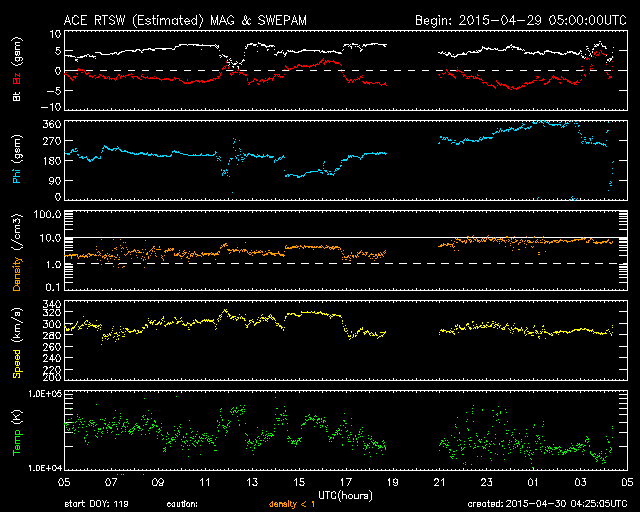 2015/ 4/30 13:26 更新 太陽風は300km/秒とかなり遅い状態です。太陽は静かです。 担当 篠原 太陽の黒点は、北半球側にあった2333群が消えて、 中央部の左下寄りの小さい黒点だけになっています。 無黒点寸前という印象です。 フレアの活動もほとんどなく、 西の端でC1.0の小さいフレアが発生している程度です。 太陽風は、280〜300km/秒とかなり遅い速度が続いています。 磁場強度は、5nTと平均的な値で安定しています。 磁場の南北成分は、振れ幅は小さいですが、 南向きの傾向が続いています。 磁気圏でも弱い活動が続いていて、 AE指数は200〜300nTの小規模の変化が頻繁に発生しています。 27日周期の図を見ると、 前周期は太陽風速度の高まりが始まっていた頃ですが、 今回はかなり低速の太陽風になっています。 SDO衛星AIA193のコロナ写真を見ると、 太陽の北半球の高緯度側にコロナホールが伸びています。 この領域の影響がこれからやってくるかもしれません。 ![]() SDO衛星のAIA193カメラによる太陽コロナの様子 (c) SDO (NASA) ![]() SDO衛星による太陽の可視光写真。マウスの矢印を写真に重ねると、黒点番号付きの写真に切り替わります。 (c) SDO (NASA) ![]() GOES衛星の太陽X線データ (c) NOAA/SWPC ![]() ACEが観測した太陽風の磁場(1番上の枠、白線は全体の強度、赤線は南北成分) および、太陽風の密度(3番目の橙線)、速度(4番目の黄線) (c) NOAA/SWPC ![]() リアルタイムAE指数 下段のAEグラフの値が高くなると、オーロラ活動が活発化しています。 (c) 京都大学, NICT ![]() 27日の太陽周期に合わせたデータプロット 太陽が同じ面を地球に向けていた27日前の変化から、今後を予想することができます。 (c) 作図:宇宙天気ニュース