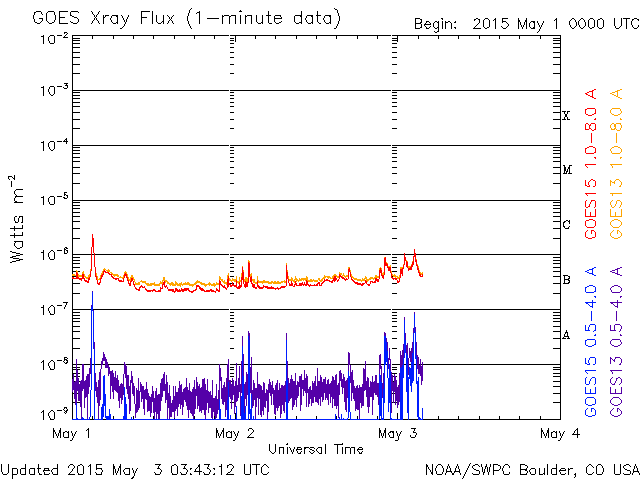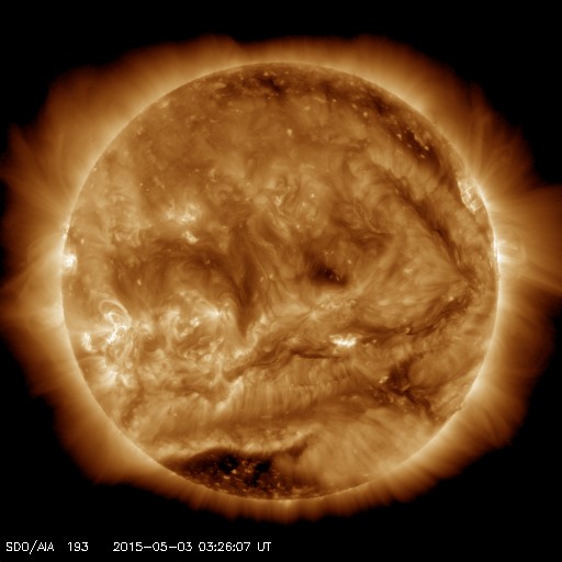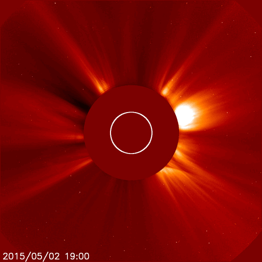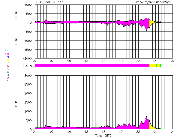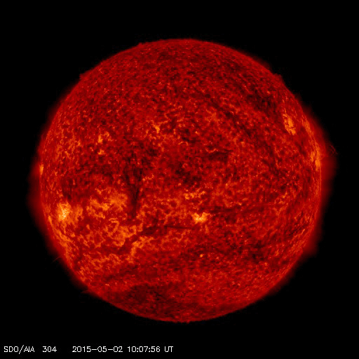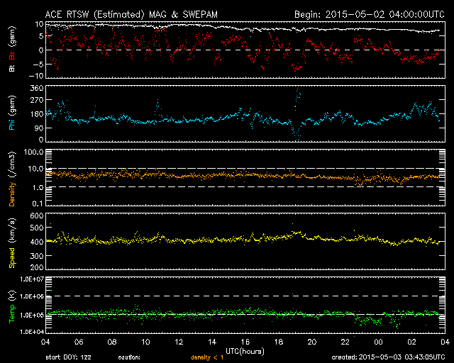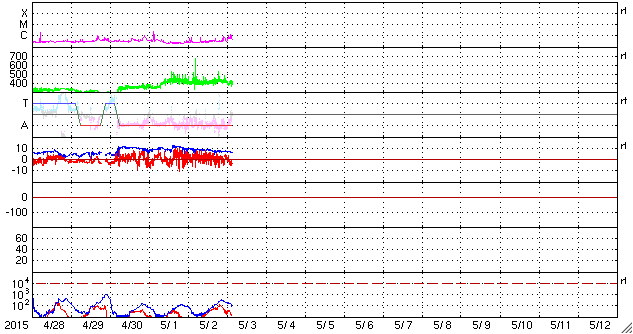 2015/ 5/ 3 12:44 更新 太陽でフィラメントの噴出が発生しました。太陽風は平均的な状態です。 担当 篠原 昨夜、太陽の南半球の中緯度を、 東西に長く延びていたダークフィラメントが噴出して、 CMEとなって太陽から広がっています。 SDO衛星AIA304と、SOHO衛星LASCO C2の動画を掲載します。 SDOの動画では、細長く横に伸びていた暗い筋が、 左端から右端へ順番に浮かび上がっています。 噴き上がったコロナのガスは、SOHO衛星の写真では、 太陽の下半分を包む様に広がっています。 この動画では、太陽の左側にもCMEが噴出する様子が見えますが、 SDO衛星では対応する変化は見られないので、 太陽の向こう側で起きた現象ではないかと思います。 かなり淡いCMEですが、 太陽を東西にまたぐように噴き出しているので、 地球へも影響がやって来るかもしれません。 4日後くらいと考えると、 7日頃の太陽風に、弱い変化が見られるかもしれません。 太陽のフレア活動は、 2335黒点群で小さい規模のフレアが見られる程度で、 穏やかな状態が続いています。 太陽風は、400km/秒と平均的な速さで安定しています。 磁場強度は、10nTからゆっくりと下がって、 6nTと平均的な値に戻りつつあります。 今回の太陽風の高まりは、この弱い変化で終わりそうです。 太陽風磁場の南北成分は、 北寄りから南寄りへ傾向が変わっています。 このため、磁気圏の活動も少し高まっていて、 AE指数のグラフの後半から変化が見られ始めています。 しかし、27日周期の図を参照すると、 太陽風は次第に弱まっていきそうです。