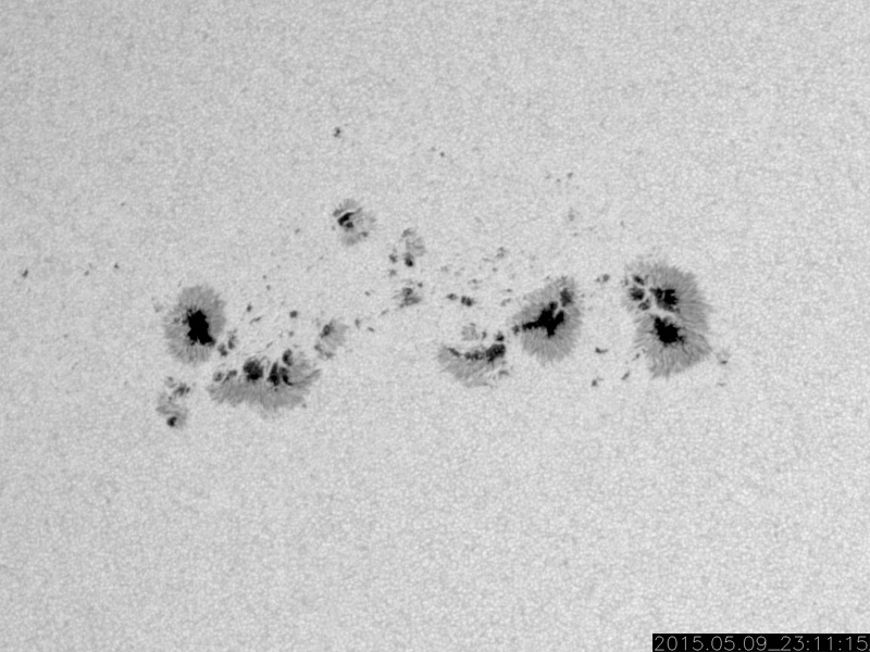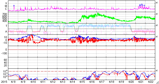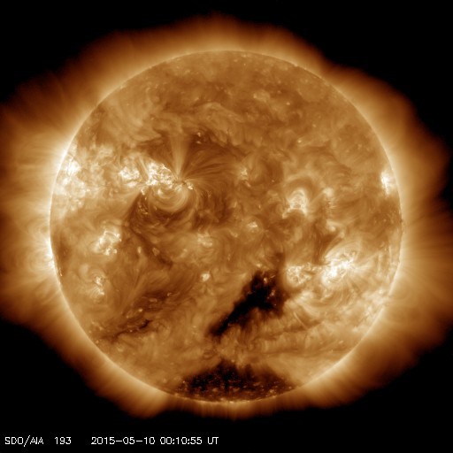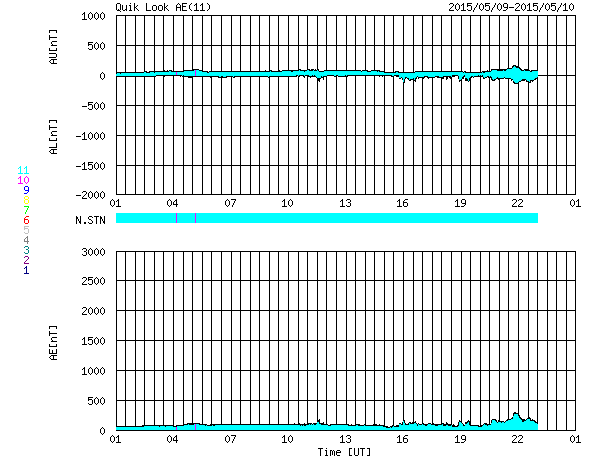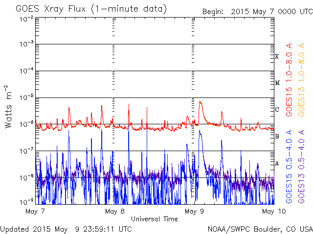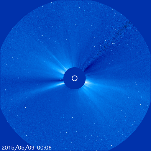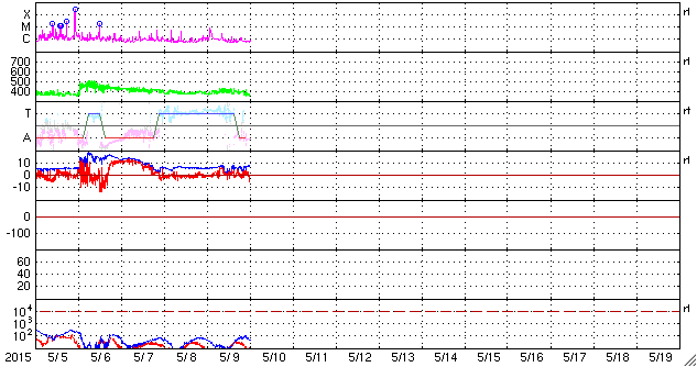 2015/ 5/10 09:20 更新 太陽の活動は穏やかになっています。太陽風はやや低速で、磁気圏も穏やかです。 担当 篠原 太陽の東端で発生したC7.4以降のフレアの発生は、 2339黒点群で、C3.0、C1.6、C1.1が起きた程度で、 太陽は比較的穏やかな状態が続いています。 2339群の黒点も、あまり変化は見られません。 C7.4フレアに伴って発生したCMEの様子を、 SOHO衛星LASCO C3の動画で紹介します。 太陽から左上に向かって、コロナのガスが噴き出しています。 このCMEのすぐ後に、太陽の左下に向かって、 2つめのCMEが噴き出しています。 SDO衛星では、対応する現象は見られず、 太陽の向こう側で発生した現象の様です。 南東端の向こう側に、活発な領域があるのでしょうか。 太陽風は、360〜400km/秒の間で、 速度が小さい変化をしています。 磁場強度も、2〜7nTの範囲で細かく変化をしていますが、 27日周期の図を見ると、 太陽風磁場の大まかな方向が切り替わる、 セクター境界に伴う変化の様です。 この後、コロナホールによる太陽風の強まりが到来しそうですが、 このままその高まりに繋がっていくのか、 一旦落ち着くのか、注目して下さい。 磁気圏の活動は穏やかで、 AE指数のグラフは目立った変化はありません。 ![]() 太陽の東端で発生した2つのCME。SOHO衛星LASCO C3。 (c) SOHO (ESA & NASA)、(動画加工 : 宇宙天気ニュース ) ![]() 2339黒点群の拡大写真。SDO衛星。 (c) SDO (NASA)、(写真加工 : 宇宙天気ニュース) ![]() SDO衛星のAIA193カメラによる太陽コロナの様子 (c) SDO (NASA) ![]() SDO衛星による太陽の可視光写真。マウスの矢印を写真に重ねると、黒点番号付きの写真に切り替わります。 (c) SDO (NASA) ![]() GOES衛星の太陽X線データ (c) NOAA/SWPC ![]() ACEが観測した太陽風の磁場(1番上の枠、白線は全体の強度、赤線は南北成分) および、太陽風の密度(3番目の橙線)、速度(4番目の黄線) (c) NOAA/SWPC ![]() リアルタイムAE指数 下段のAEグラフの値が高くなると、オーロラ活動が活発化しています。 (c) 京都大学, NICT ![]() 27日の太陽周期に合わせたデータプロット 太陽が同じ面を地球に向けていた27日前の変化から、今後を予想することができます。 (c) 作図:宇宙天気ニュース