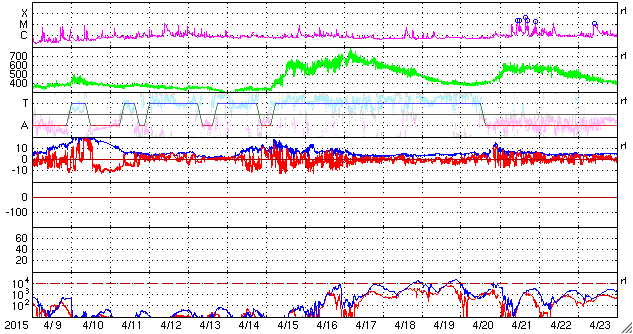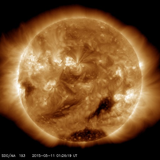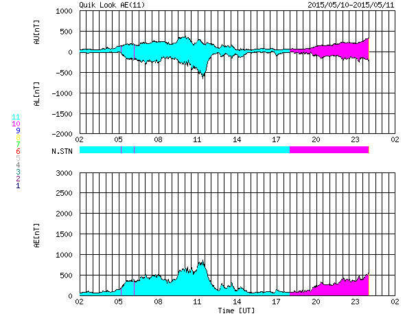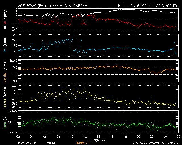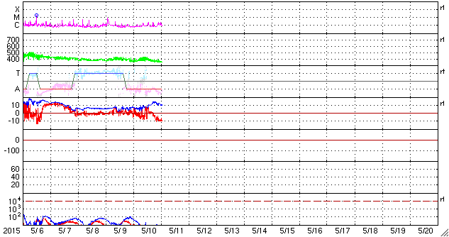 2015/ 5/11 10:45 更新 太陽風磁場の強まりが到来し、磁気圏の活動もやや高まっています。 担当 篠原 昨夜、10日21時(世界時10日12時)頃から、 太陽風の磁場が強まり始め、 11日2時(世界時10日17時)には、15nTに達しました。 今朝に入って少し下がりましたが、 現在も10nTと強まった状態です。 7日のニュースで紹介した、 太陽の中央部南寄りで発生した、 フィラメント噴出に関係した乱れかもしれません。 到来まで4日半ほどかかっていて、 タイミングとしては良い頃だと思います。 太陽風の速度は大きな変化はなく、 370k/秒から一時的に400km/秒へ少し上がりましたが、 今日に入った頃から再び360km/秒と低速の風に戻っています。 太陽風磁場の強まりに関係して、 磁場の南北成分が大きく変化しています。 磁場の強まりが最大に達した11日2時(世界時10日17時)頃から、 磁場の南北成分は南向きに振れ始め、 11日4時(世界時10日19時)以降は、 -10nT近い強い南向きが続いています。 磁気圏の活動は、AE指数のグラフの前半も高まっていましたが、 後半に入って再び変化が高まっています。 更に、コロナホールによる太陽風の乱れも始まる可能性があります。 SDO衛星AIA193では、コロナホールはだいぶ西側に進んでいます。 引き続き注目して下さい。 太陽は、2339黒点群でC1〜2の小さいフレアが5回発生した程度で、 それほど活動的ではありません。 太陽の東端も、現在は活動は見られず穏やかです。 一方、可視光写真では黒点群がかなり増えて、 にぎやかになっています。