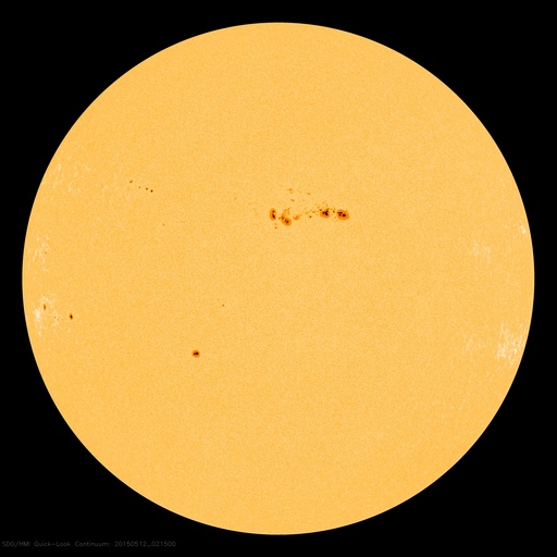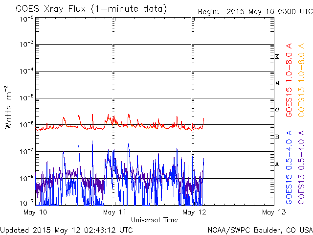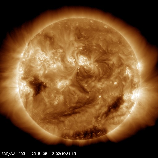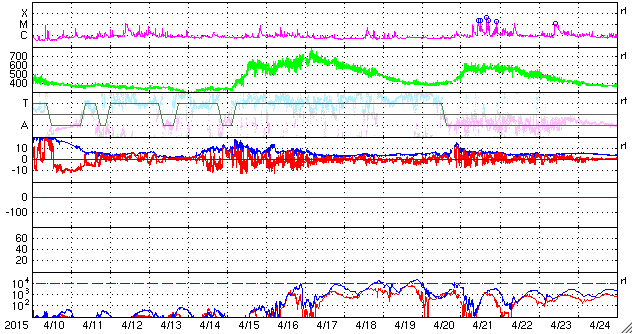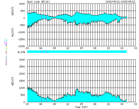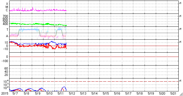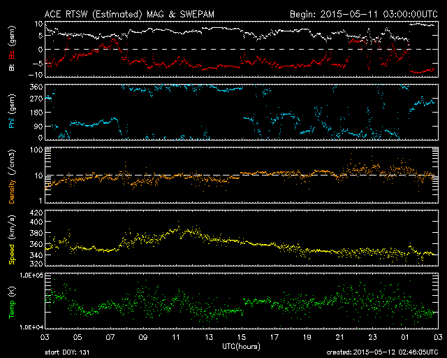 2015/ 5/12 11:46 更新 太陽風磁場の南向きが続き、磁気圏もやや活動的です。 担当 篠原 10nTに強まっていた太陽風の磁場強度は、 その後、7nTから3nTにかけて小さく変化しながら弱まりました。 そして、今朝、12日10時(世界時12日2時)に、 再び10nT近くに強まる変化が来ています。 その間、速度は360km/秒から340km/秒へ少し下がり、 より低速の状態になっています。 磁場の南北成分は、南向きに強まった状態が続いています。 速度が遅いこともあり、大きな変化にはなっていませんが、 AE指数は、500nTを超える中規模の活動が続いています。 この後、コロナホールによる太陽風速度の高まりが 見られるでしょうか。 太陽は、更に黒点群の数が増えて、 可視光写真はかなりにぎやかになっています。 しかし、フレアの発生はそれほど活発ではなく、 C1〜C2の小さいフレアが、 2335群、2338群、2339群、2342群で、7回発生した程度です。
