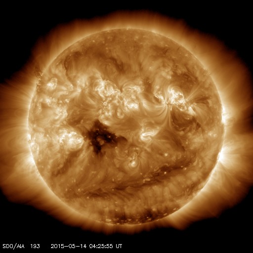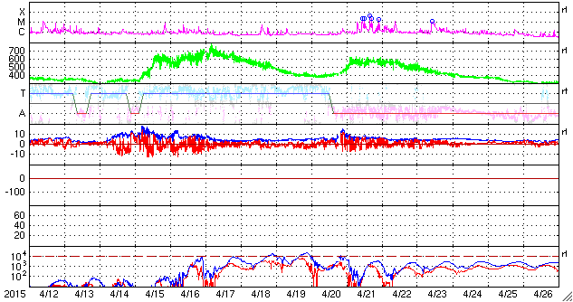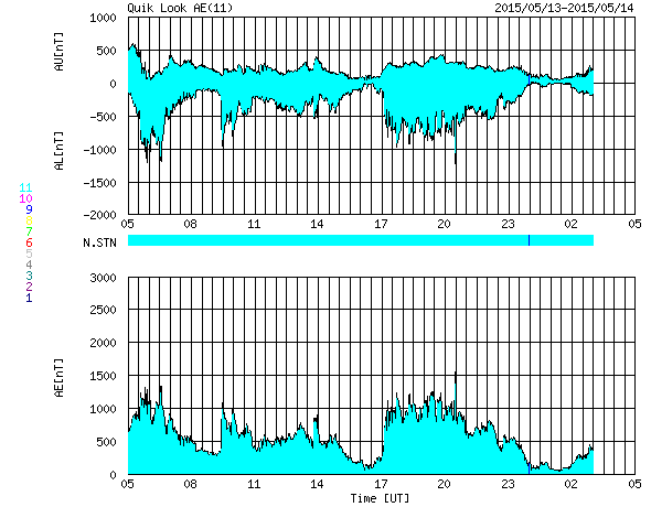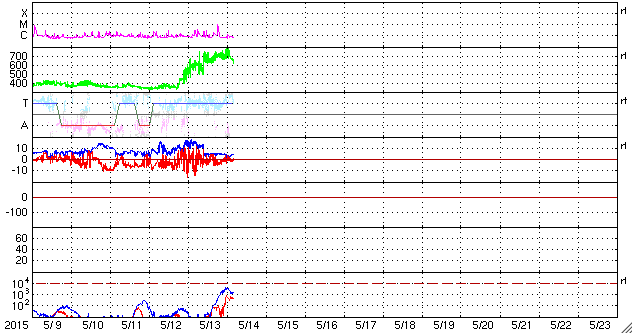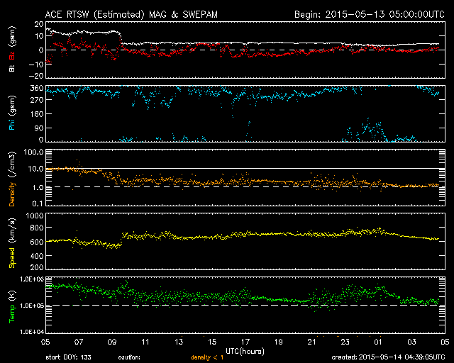 2015/ 5/14 13:39 更新 太陽風の速度は700km/秒まで高まりました。カナダのオーロラをどうぞ。 担当 篠原 カナダの高坂雄一さんより、 ブリティッシュコロンビア Lumbyで、 現地12日2時頃(世界時12日9時)に撮影されたオーロラの写真が届きました。 太陽風の磁場が強まって、 南向きにも-10nT程度に強まっていた頃の活動です。 昨日のニュースを見ると、 AE指数も1000nT近くの変化をしていました。 Lumbyは、カナダの南西の端に近く、 オーロラ帯からはだいぶ南に離れています。 この地域までオーロラが広がっていたということは、 磁気圏の活動もそれだけ強まっていたことを示しています。 地平線の近くのオーロラを眺めているという写真ですが、 地上の景色など、普段とは一味違ったオーロラの写真になっています。 3枚目の日周運動の見事な写真は、 低空の赤いオーロラならではの撮影かもしれません。 どうもありがとうございます。 太陽風は、昨夕、13日19時(世界時13日10時)に、急な変化が発生して、 速度は、600km/秒から700km/秒近くに高まりましたが、 磁場強度は15nTから5nTに一気に弱まりました。 その後、磁場強度は5nTで安定していますが、 速度は今朝にかけて750km/秒近くまで高まり、 現在は640km/秒に下がっています。 27日周期の図を見ると、前周期に負けないような、 速度や磁場の高まりが到来しています。 磁場強度が下がったので、今後は速度も次第に低下していくでしょう。 磁気圏では、活発な活動が続いています。 AE指数は、1200nTに達する激しい変動が続いています。 太陽は、2345黒点群でC9.2と大きいCクラスの 小規模フレアが発生しました。 SDO衛星AIA193の動画を見ると、 C9.2のフレアは、太陽の北西寄り(右上)で発生し、 このフレアの直前には、 太陽の中央部南寄りでも爆発が起きています。 これらの活動により、弱いCMEが噴き出しているかもしれません。 SOHO衛星LASCO C3の写真に注目して下さい。 ![]() カナダ・ブリティッシュコロンビア Lumbyで、現地12日2時頃(世界時12日9時)に撮影されたオーロラ。 (c) 高坂雄一氏 ![]() カナダ・ブリティッシュコロンビア Lumbyで、現地12日2時頃(世界時12日9時)に撮影されたオーロラ。 (c) 高坂雄一氏 ![]() カナダ・ブリティッシュコロンビア Lumbyで、現地12日2時頃(世界時12日9時)に撮影されたオーロラ。 (c) 高坂雄一氏 ![]() 太陽の中央部でフレア活動が発生しています。 (c) SDO (NASA)、 (動画加工 : 宇宙天気ニュース) ![]() SDO衛星のAIA193カメラによる太陽コロナの様子 (c) SDO (NASA) ![]() SDO衛星による太陽の可視光写真。マウスの矢印を写真に重ねると、黒点番号付きの写真に切り替わります。 (c) SDO (NASA) ![]() ACEが観測した太陽風の磁場(1番上の枠、白線は全体の強度、赤線は南北成分) および、太陽風の密度(3番目の橙線)、速度(4番目の黄線) (c) NOAA/SWPC ![]() リアルタイムAE指数 下段のAEグラフの値が高くなると、オーロラ活動が活発化しています。 (c) 京都大学, NICT ![]() 27日の太陽周期に合わせたデータプロット 太陽が同じ面を地球に向けていた27日前の変化から、今後を予想することができます。 (c) 作図:宇宙天気ニュース
