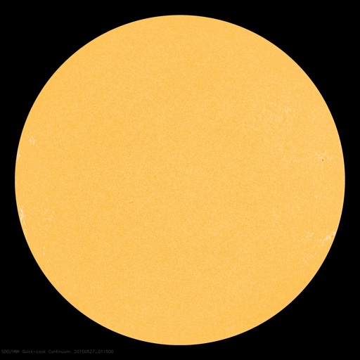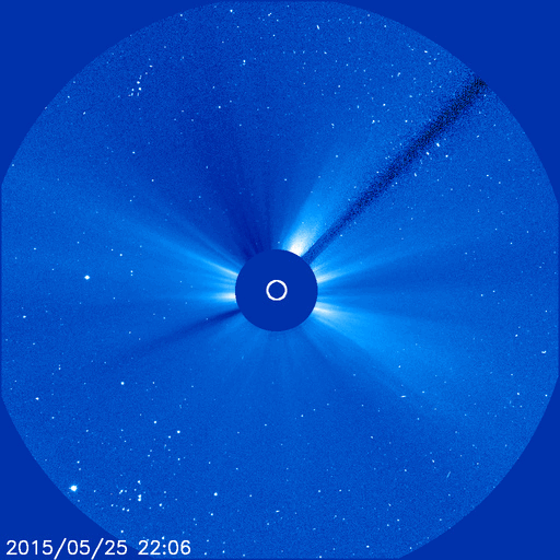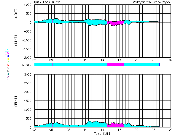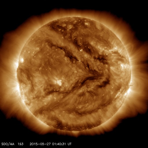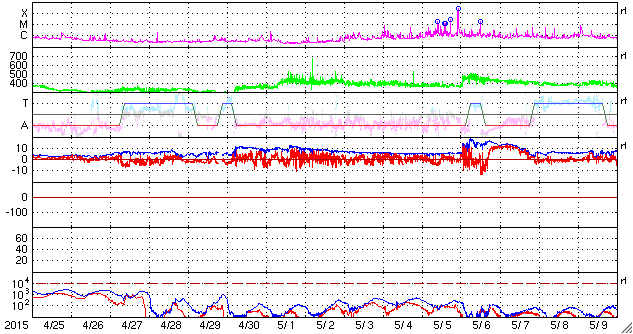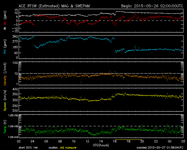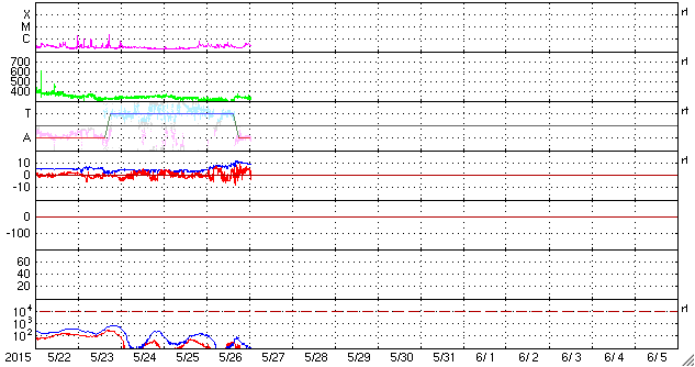 2015/ 5/27 10:58 更新 太陽の黒点が少なくなっています。太陽風は低速風が続いています。 担当 篠原 昨日のフィラメント噴出によるCME(太陽ガスの放出現象)の様子を、 SOHO衛星LASCO C3の動画で紹介します。 太陽の左側に向かって、ゆっくりとガスが飛び出しています。 横に向かっているので、地球への影響はありません。 右上の隅に、C3の写野を通り過ぎようとしている プレアデス星団(すばる)が写っています。 また、太陽の左側には、火星(明るい方)と水星(暗い方)も写っています。 周囲の星々とずれて動いている2つの星です。 また、左下には、おうし座の頭にあたるヒアデス星団(V字の星の並び)と、 一等星アルデバランも見えています。 CMEだけでなく、なかなかにぎやかな写真です。 太陽は今日も穏やかで、目立ったフレアの発生はありません。 黒点も、昨日よりさらに小さくなっていて、 掲載の可視光写真では、見えるか見えないかです。 太陽の東端の向こう側には、やや活動的な領域がある様です。 どの様な領域が現れるでしょうか。 太陽風は、27日1時(世界時26日16時)に、 磁場強度が10nTに強まる変化が発生しています。 27日周期の図を見ると、セクターの切り替わりが発生した様です。 前周期の太陽風と同様の変化になっています。 同じ頃に、太陽風の速度も、 310km/秒から340km/秒に少しだけ上がっています。 その後下がって、現在は320km/秒です。 低速の状態は変わっていません。 前周期は、セクターの変化から1日ほど経って、 速度が400km/秒台に上がりました。 この後の推移に注目してください。 磁気圏は概ね静穏で、 AE指数は、200〜300nTの小さい変化が 起きている程度です。