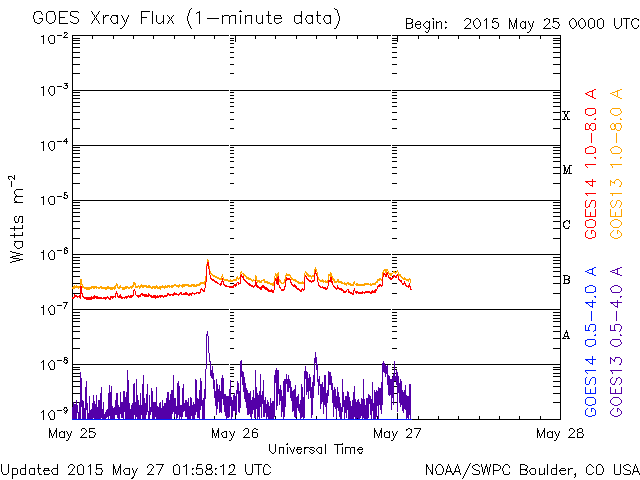 (c) SOHO (ESA & NASA)、 (動画加工 : 宇宙天気ニュース) ![]() SDO衛星のAIA193カメラによる太陽コロナの様子 (c) SDO (NASA) ![]() SDO衛星による太陽の可視光写真。マウスの矢印を写真に重ねると、黒点番号付きの写真に切り替わります。 (c) SDO (NASA) ![]() GOES衛星の太陽X線データ (c) NOAA/SWPC ![]() ACEが観測した太陽風の磁場(1番上の枠、白線は全体の強度、赤線は南北成分) および、太陽風の密度(3番目の橙線)、速度(4番目の黄線) (c) NOAA/SWPC ![]() リアルタイムAE指数 下段のAEグラフの値が高くなると、オーロラ活動が活発化しています。 (c) 京都大学, NICT ![]() 27日の太陽周期に合わせたデータプロット 太陽が同じ面を地球に向けていた27日前の変化から、今後を予想することができます。 (c) 作図:宇宙天気ニュース