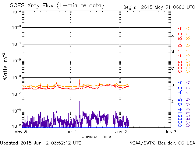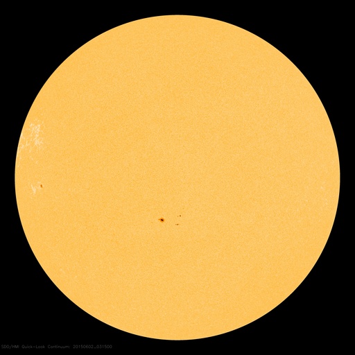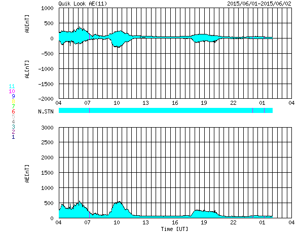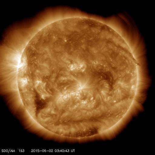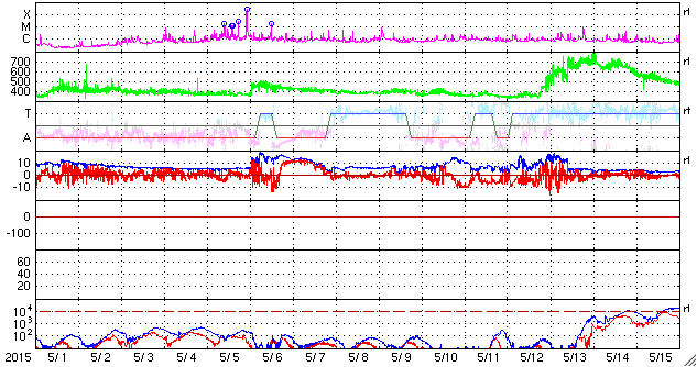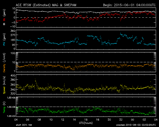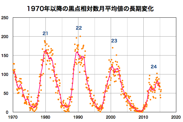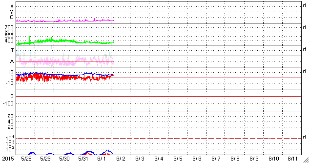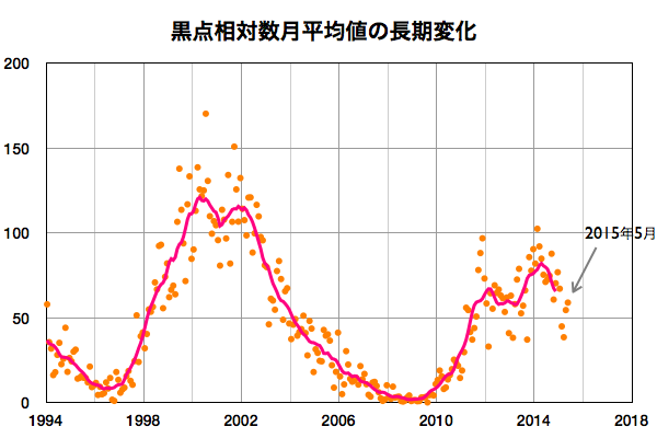 2015/ 6/ 2 12:52 更新 低速の太陽風が続いています。5月の黒点数は58.8でした。 担当 篠原 WDC-SILSOより、5月の黒点相対数が発表され、 月平均値は 58.8 でした。 4月の54.4とほとんど変わらず、 長期変化の図を見ると、 2014年後半からの減少傾向に沿った値となっています。 今回は、1970年以降の45年間のグラフも作成しました。 第21〜23期の活動周期と比較すると、 現在の第24期ピークが、だいぶ低かったことがよく分かります。 今後、2020年にかけて減少が続くと思われますが、 過去の様子と見比べながら変化に注目して下さい。 その太陽では、フレアの発生はなく、 穏やかな状態が続いています。 中央の2356黒点群のとなりに、新しく2359黒点群が現れています。 太陽風は、350km/秒と低速の風が続いています。 磁場強度も、5nTと平均的な値で安定しています。 磁場の南北成分は、南寄りから、次第に北向きに振れる様になり、 AE指数は、前半に500nTの変化が起きていますが、 次第に静かになっています。 SDO衛星AIA193の太陽写真では、 南東(左下)のコロナホールが、中央部に少し近づいています。 明日くらいになると、コロナの「穴」らしく見えそうです。