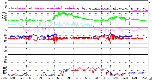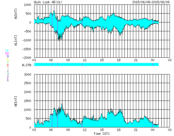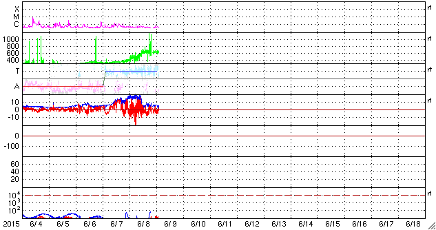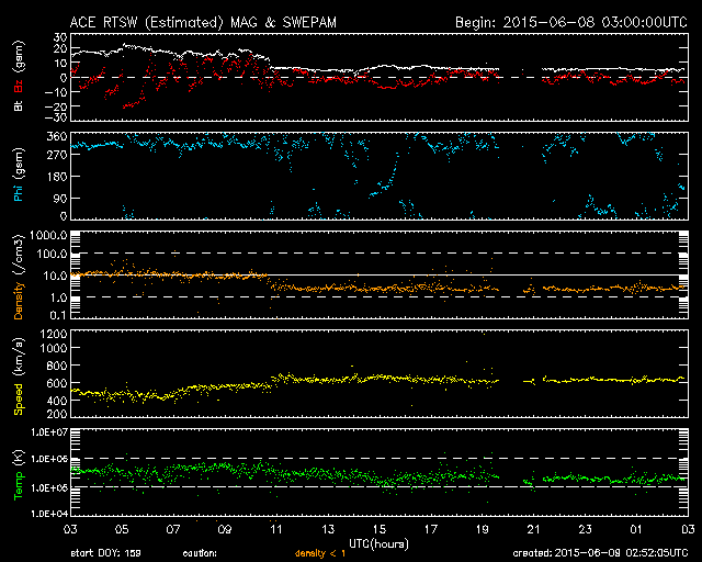 2015/ 6/ 9 11:52 更新 太陽風の強まりにより、磁気圏の活動が高まっています。カナダのオーロラをどうぞ。 担当 篠原 カナダ・ブリティッシュコロンビア Lumbyの高坂雄一さんより、 現地8日1〜2時(世界時8日8〜9時)に撮影された オーロラの写真をいただきました。 Lumby (バンクーバーの東方です)は、 オーロラ帯と言われる地域からだいぶ南に下がっています。 このため、磁気圏の活動が激しくなって、 オーロラの領域が低緯度側に広がると、この地域で見ることができます。 今回も、磁気圏活動の強まりに合わせて写真を撮ったところ、 肉眼では全く分からなかったものの、 写真で捉えることができたとのことです。 最初の2枚は、現地1時頃の撮影です。 空全体に赤みがかかり、地平線近くには緑色の光も写っています。 続く2枚は、現地2時半の撮影で、 この頃には縦の筋も見えていた様です。 こちらの写真では、空が明るくなり始めているようにも見えます。 夏至も近くなって朝が早くなっているのでしょうか。 高坂さんによると、日中はかなり暑く、 前日の気温は35℃に達したそうです。 鹿児島の真夏と変わりませんね。(湿度は負けないと思いますが) その時の温度計の写真もいただきました。 0℃を挟んで、プラスとマイナスにそれぞれ50℃まで刻んであります。 両方に思いきり暑くも寒くもなるということですね。 オーロラ情報の速報をどうもありがとうございます。 このオーロラの活動をもたらしたのは、 太陽風磁場の大きな変化です。 昨日のニュース以降も、磁場強度は20nT近くに高まった状態が続き、 南北成分も大きく変化しました。 8日14時(世界時8日5時)には、-20nTと、 かなり強い南向きが到来しています。 この頃の太陽風の速度は、500km/秒でした。 この影響で、AE指数は1000〜1300nTに達する大きな変動が発生し、 Dst指数(速報値)も -63nTに下がって、小さい磁気嵐になっています。 その後、8日20時(世界時8日11時)頃に、 太陽風の速度が600km/秒に上がり、 反対に、磁場強度は5nTと平均的な値に下がります。 磁気圏の活動は活発に続いていて、 AE指数は500nTから1000nTに達する変化が観測されています。 27日周期の図は、データエラーのため、 速度のグラフの縦軸が上下で異なっていて、 見るときに注意が必要です。 磁場強度と速度の高まりは、前周期よりも1日ほど早まりましたが、 同じ程度の強まりになっています。 前周期を参考にすると、もう1日程度高い速度を保ち、 その後、ゆっくりと低下に向かうかもしれません。 今後は、放射線帯の高エネルギー電子の増加にも注目して下さい。 太陽は、フレアの発生はなく、穏やかです。 ![]() カナダ・ブリティッシュコロンビア Lumbyで、現地8日1時頃(世界時8日8時)に撮影されたオーロラ。 (c) 高坂雄一氏 ![]() カナダ・ブリティッシュコロンビア Lumbyで、現地8日1時頃(世界時8日8時)に撮影されたオーロラ。 (c) 高坂雄一氏 ![]() カナダ・ブリティッシュコロンビア Lumbyで、現地8日2時半(世界時8日9時半)に撮影されたオーロラ。 (c) 高坂雄一氏 ![]() カナダ・ブリティッシュコロンビア Lumbyで、現地8日2時半(世界時8日9時半)に撮影されたオーロラ。 (c) 高坂雄一氏 ![]() 昼間は、気温が35℃に達したそうです。 (c) 高坂雄一氏 ![]() SDO衛星のAIA193カメラによる太陽コロナの様子 (c) SDO (NASA) ![]() SDO衛星による太陽の可視光写真。マウスの矢印を写真に重ねると、黒点番号付きの写真に切り替わります。 (c) SDO (NASA) ![]() ACEが観測した太陽風の磁場(1番上の枠、白線は全体の強度、赤線は南北成分) および、太陽風の密度(3番目の橙線)、速度(4番目の黄線) (c) NOAA/SWPC ![]() リアルタイムAE指数 下段のAEグラフの値が高くなると、オーロラ活動が活発化しています。 (c) 京都大学, NICT ![]() 27日の太陽周期に合わせたデータプロット 太陽が同じ面を地球に向けていた27日前の変化から、今後を予想することができます。 (c) 作図:宇宙天気ニュース