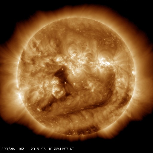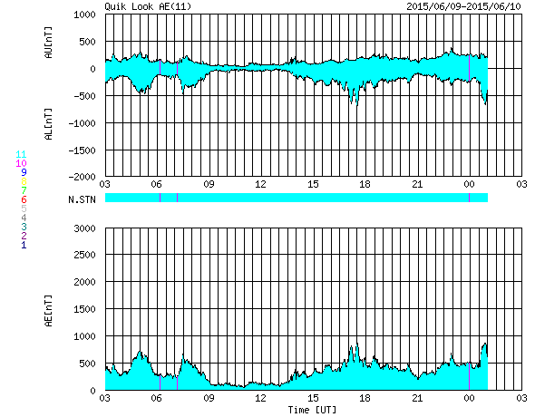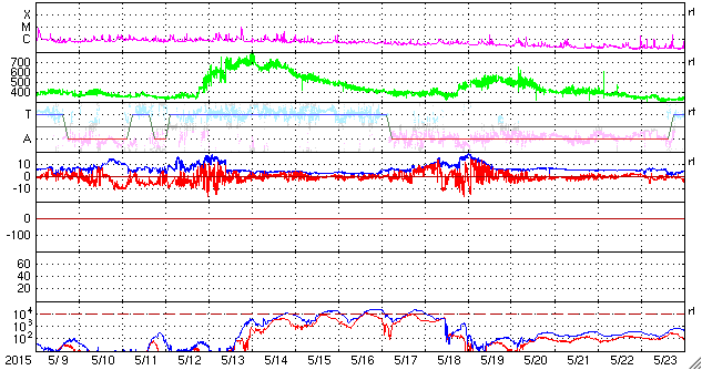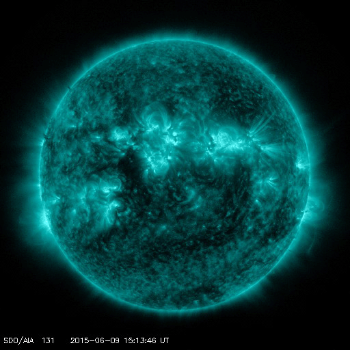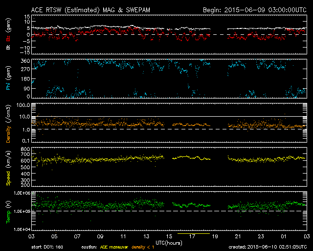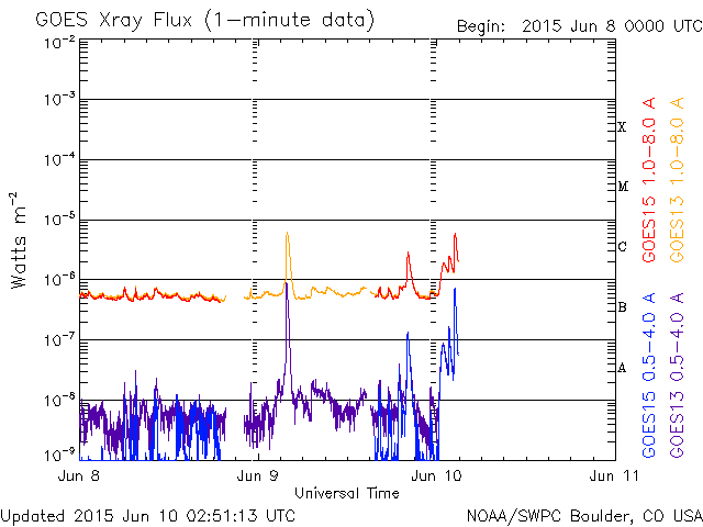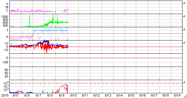2015/ 6/10 11:51 更新 600km/秒の高速太陽風が続いています。Cクラスのフレアがあちこちで発生しています。 担当 篠原 太陽風は、600〜650km/秒と高い速度を保っています。 磁場強度は、5nTと平均的な値で安定しています。 磁場の南北成分は、振れ幅は小さいですが、 比較的南向きに変化しています。 磁気圏の活動も活発に発生していて、 AE指数は、500〜800nTの中規模の変化が連続的に発生しています。 27日周期の図の前周期を見ると、 高速の太陽風は、2日ほど続いて速度の低下が始まっています。 今回も同様と考えると、 今日あたりから速度は下がり始めるかもしれません。 太陽では、Cクラスのフレアが増えています。 9日13時(世界時9日4時)に南東(左下)の2364黒点群でC5.8、 10日5時(世界時9日20時)に西寄りの2360群でC2.8、 そして、10日10時から11時にかけて(世界時10日1〜2時)、 南東の2365群と、2360群でそれぞれC2のフレアが発生し、 続いて、東の端でC6.0のフレアが発生しています。 これらのフレアの様子をSDO衛星AIA131の動画で紹介します。 小規模のフレアばかりですが、あちこちでにぎやかに起きています。 最後のフレアを起こした領域は、これから姿を現す様です。 注目してください。 太陽風の強まりを受けて、 放射線帯の高エネルギー電子も増加しています。 しかし、現時点では1000を越えた程度で、 大きな増加にはなっていません。