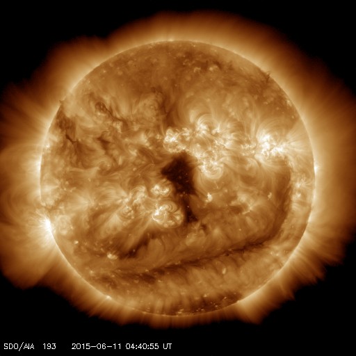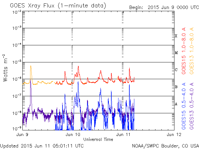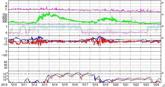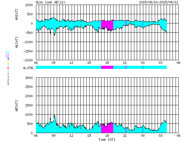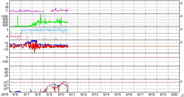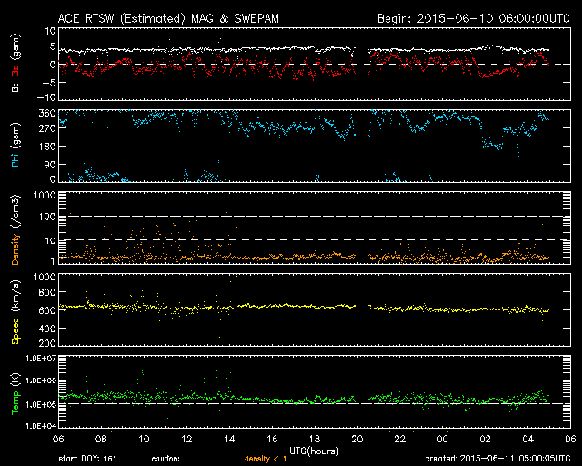 2015/ 6/11 14:01 更新 600km/秒の高速太陽風が続いています。ニュージーランドのオーロラをどうぞ。 担当 篠原 ニュージーランド南島のダニーデンの中村太一さんより、 8日夜に撮影された素敵なオーロラ写真をいただきました。 太陽風が強まって、磁場が大きく南を向き、 小規模の磁気嵐が発生した頃のオーロラで、 9日のカナダの高坂さんの写真と同じ夜の南半球の空です。 ダニーデンの海沿いで撮影したとのことです。 1枚目は縦の筋が一番高く伸びていた頃だそうで、 赤と緑のオーロラが、雲と重なって独特の美しさになっています。 2枚目は銀河に沿う様に赤いオーロラが伸びています。 本当に見事です。 そして、3枚目はアシカが一緒に写っています。 南島はアシカやセイウチが多いそうですが、 これほど人懐っこいのは希だそうです。 頭上の大小のマゼラン雲も見事です。 とても素晴らしいオーロラの写真をどうもありがとうございます。 中村さんからは、タイムラプスの動画ファイルもいただきました。 ページに貼るのは難しいので、こちらにリンクを掲載します。 とても美しい光景です。どうぞご覧下さい。 動画1 動画2 太陽風は、速度はまだ下がらず、 600km/秒と高い速度が続いています。 磁場強度は、4nTへわずかに下がっています。 磁場の南北成分は、0nTを挟んで南北に小さく変化しています。 このため、磁気圏の活動も高まった状態が続いていて、 AE指数は、500nT前後の小・中規模の活動が続いています。 600km/秒台の高速風は、3日目に入っています。 下がり始めるのは近いと思いますが、 今回はどこまで続くのか、注目してください。 太陽は、昨日のC6.0以降、 C1〜2の小さいフレアが7回ほど発生し、 先ほど、11日11時半(世界時11日2時半)に、 西の2360黒点群で、C4.6のフレアが発生しました。 激しい活動ではありませんが、活発さをやや取り戻しています。 放射線帯の高エネルギー電子は、更に増加して、 10,000のラインを越えています。 高速の太陽風が続いているので、更に高まるかもしれません。